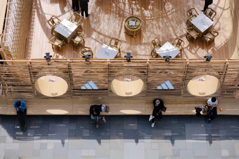 The perimeter wall defines the site boundary while concealing all MEP systems within its depth. Floor and wall are unified through a continuous weave of bamboo—bending fluidly from vertical to horizontal, forming a seamless surface. On the exterior, the bamboo wall extends into prefabricated benches, softening the boundary and opening the structure toward the city. This outward gesture invites passersby at Taikoo Li to pause, rest, and engage—encouraging everyday interaction between the installation and urban life.
