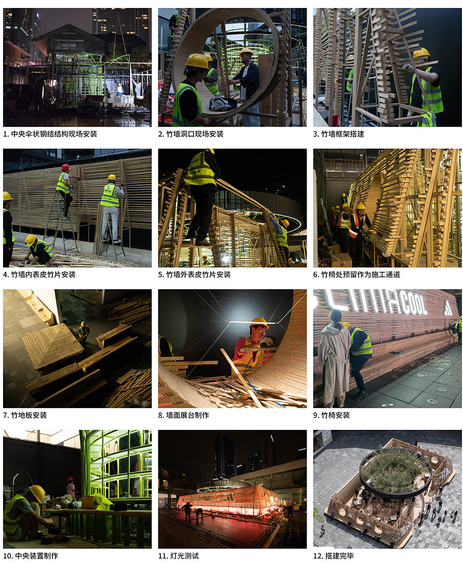 当承接本次竹材搭建任务的施工团队所雇佣的在地手工匠人的效率难以赶上茶馆开放的限时节点时。设计团队仿佛全能战士,用建筑师对项目完成度的执着和热情,从现场技术把控的本职工作,变身为撸起袖子的编竹小工。项目虽拥有持续五天的搭建周期,实则受限于白天营业的施工管制,实际可操作时间只有50小时。在这极限时间内,团队在突降暴雨与材料延迟的双重压力下高效协作,最终力保装置如期呈现。