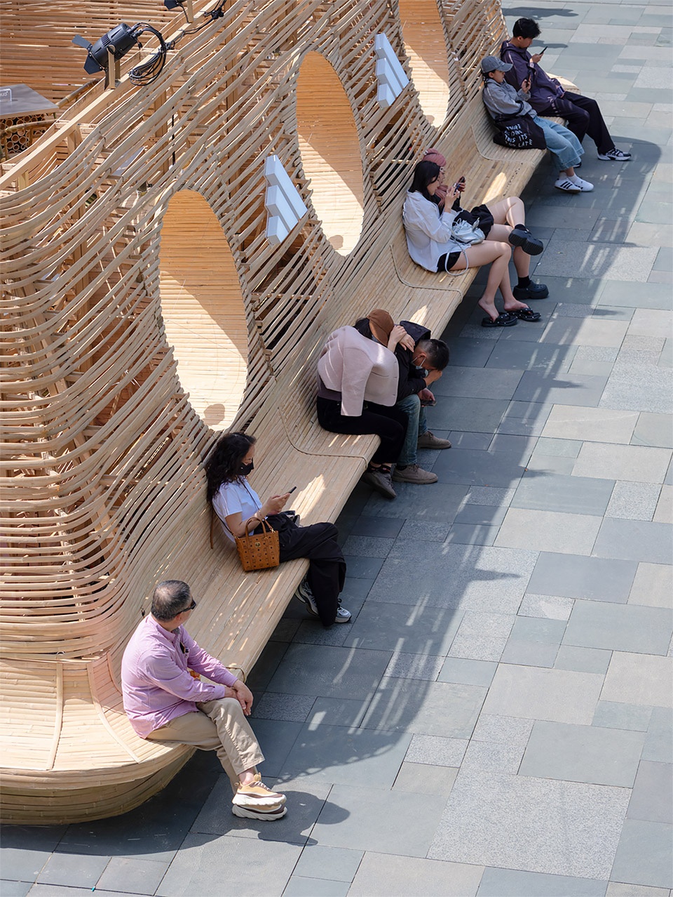 竹制坐凳作为标准单元,与竹编墙体一体化构建,为限时装置的排队人流以及广场上的游客和市民,提供休息等候的空间。竹凳既承担休憩与引导,也定义了空间的柔性边界。