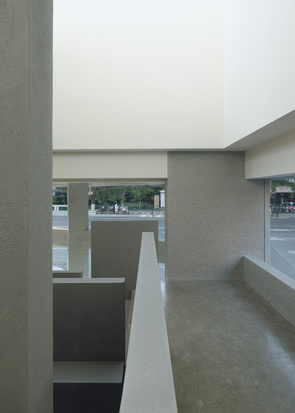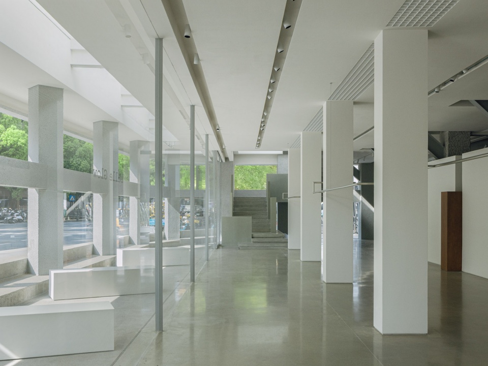 视线穿过高大的人行道上的树缝,可以一窥建筑之貌,朝向街道的立面由原本常规的独立店铺贯穿为整层的服务用地。从远处望去,柱体之上,架起一个多边形的封闭实体,上下两段,虚实分明。主动线处左右各设一片矮墙,有意构成虚掩的入口,内外连续,迎接每一位访客的抵达。
