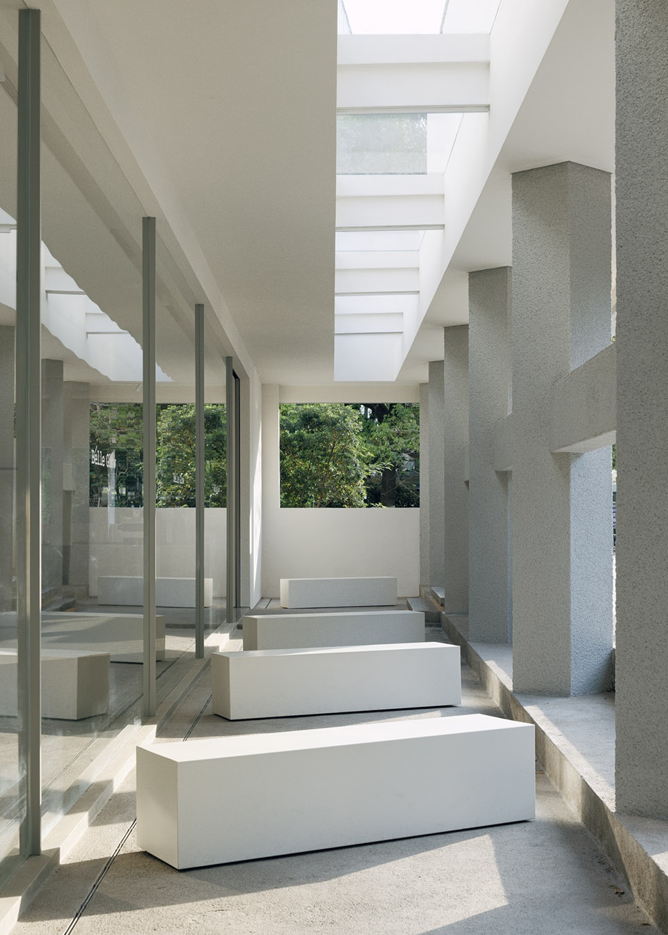 Peering through the foliage of street-side trees, glimpses of the building’s façade reveal a unified street-facing elevation, where fragmented retail units have been transformed into a cohesive service zone. From afar, a polygonal massing floats atop a colonnade, delineating a binary composition of solid and void. Flanking the primary circulation path, two low-profile walls frame a recessed entrance, dissolving the threshold between exterior and interior to invite exploration.