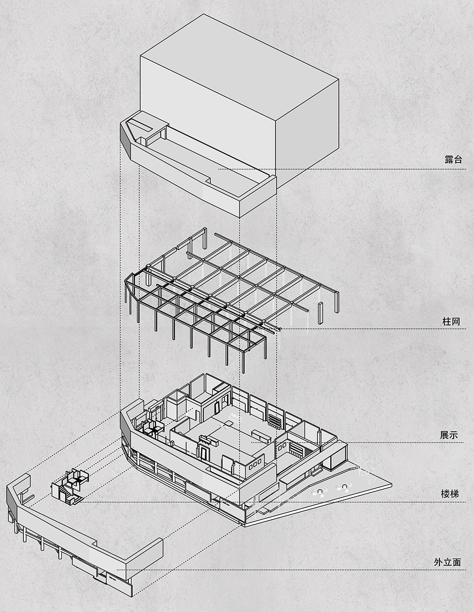 ▼场地中的柱体是关键的表达对象,the existing column grid was elevated as a primary design element