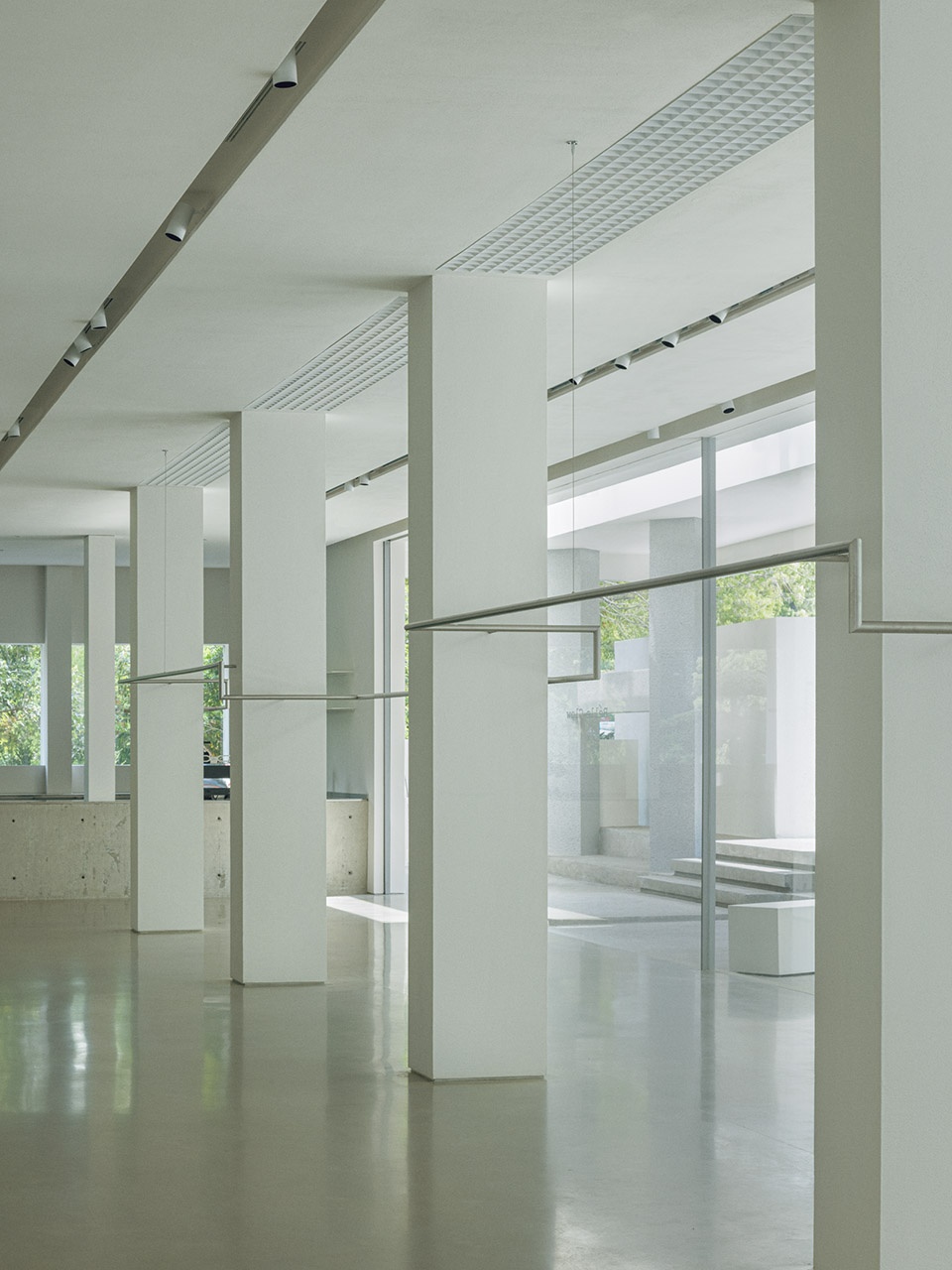 ▼白柱和服饰悬挂的金属杆交错,white-painted columns intersect with suspended metal garment rails