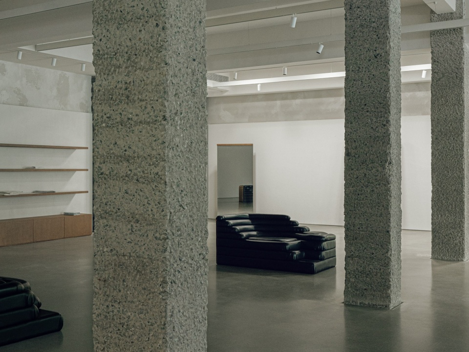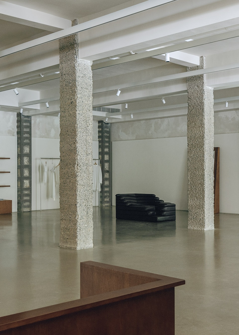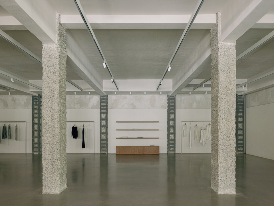 During spatial programming, the existing column grid was elevated as a primary design element. Progressing inward, five distinct rows of columns—each with unique textural treatments—generate a dynamic visual rhythm. In the lobby, white-painted columns intersect with suspended metal garment rails, their linear geometries echoing the building’s glass-and-metal fenestration to imbue the space with refined tactility.