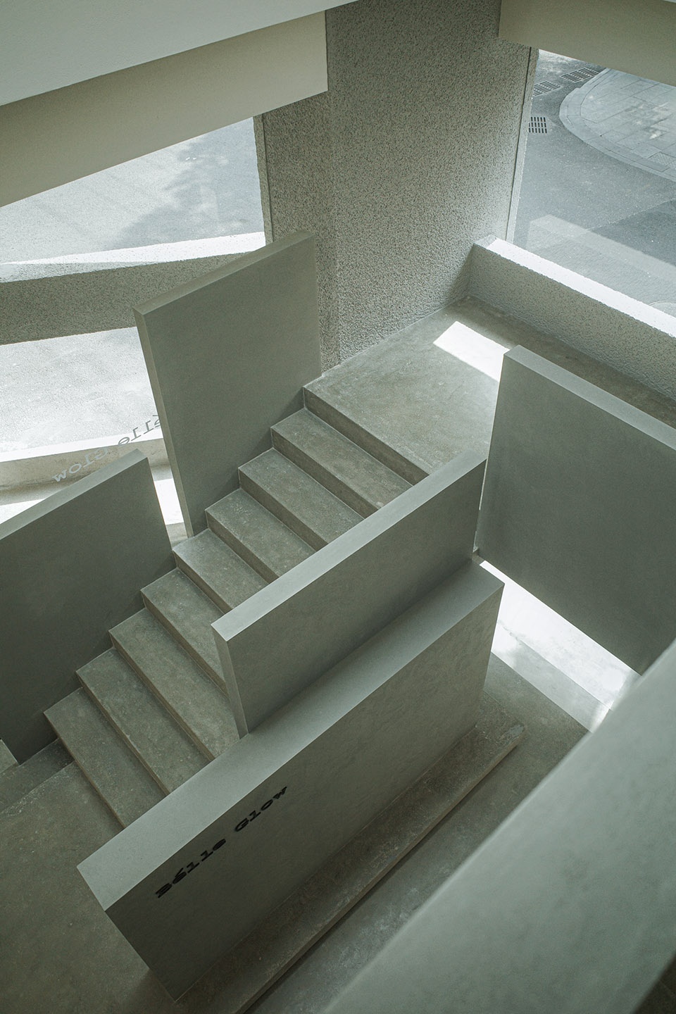 雕塑是静态的舞蹈。西侧临街处,一座凝固的“雕塑”凭借外部长条柱体、结构横梁的拉力,由地面生长而出,连接上下楼层。扶手采用片墙形态,横竖穿插,交错排布。相较于一般的楼梯样式,Bélle Glow的楼梯更像是一个垂直的“秀场”,适用新品展示、发布、拍摄等不同动态场景。