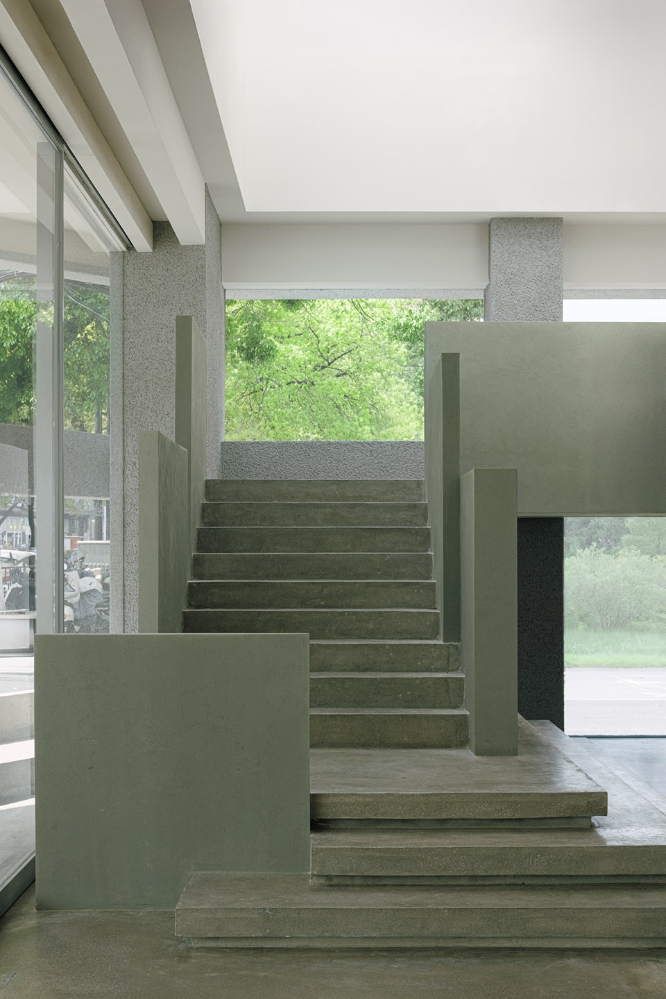 Sculpture is architecture in stasis. Anchored by elongated vertical piers and cantilevered beams, a stairwell ascends from the western façade as a monolithic “sculpture.” Its balustrade, composed of interlocking planar slabs, transcends mere circulation to become a vertical “catwalk”—a multifunctional platform for product launches, exhibitions, and immersive brand storytelling.