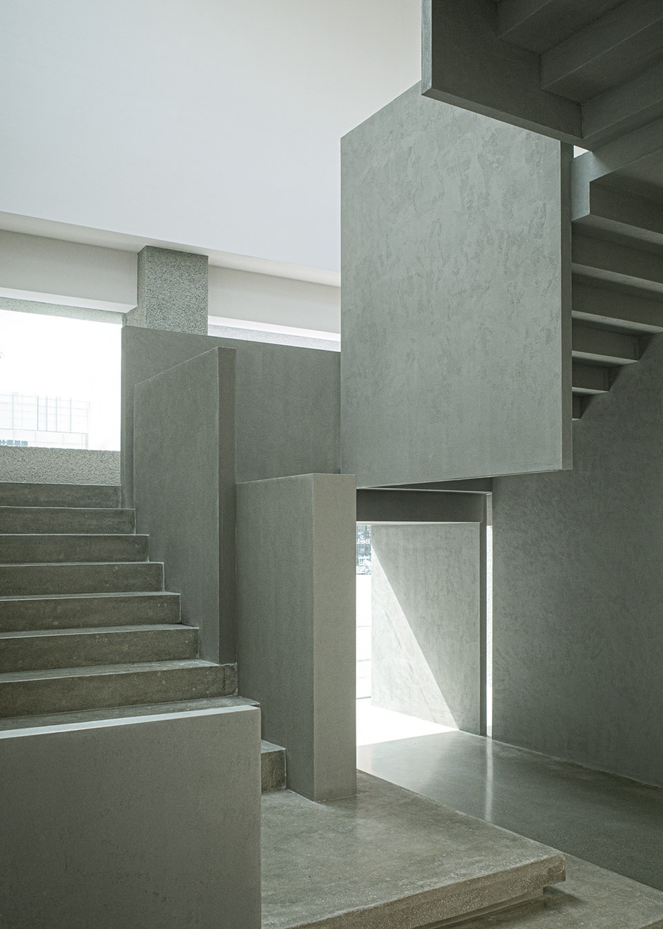 在“没有线,只有体积”的艺术表达之中,光影的捕捉也尤为重要,它从另一个侧面反映了边界的存在,并最大可能地尝试雕刻出既有的形体轮廓,使其愈发清晰可见。采用曲折、连续的步梯设计,有意让视线随着路径的改变而产生差异性景观,以此丰富行进中的感知体验。