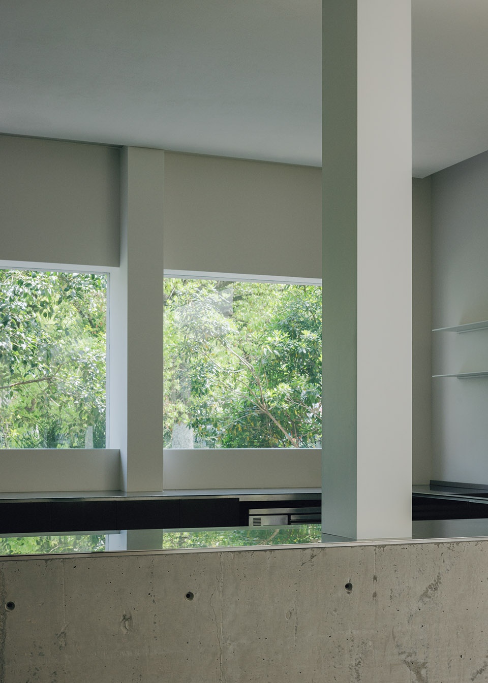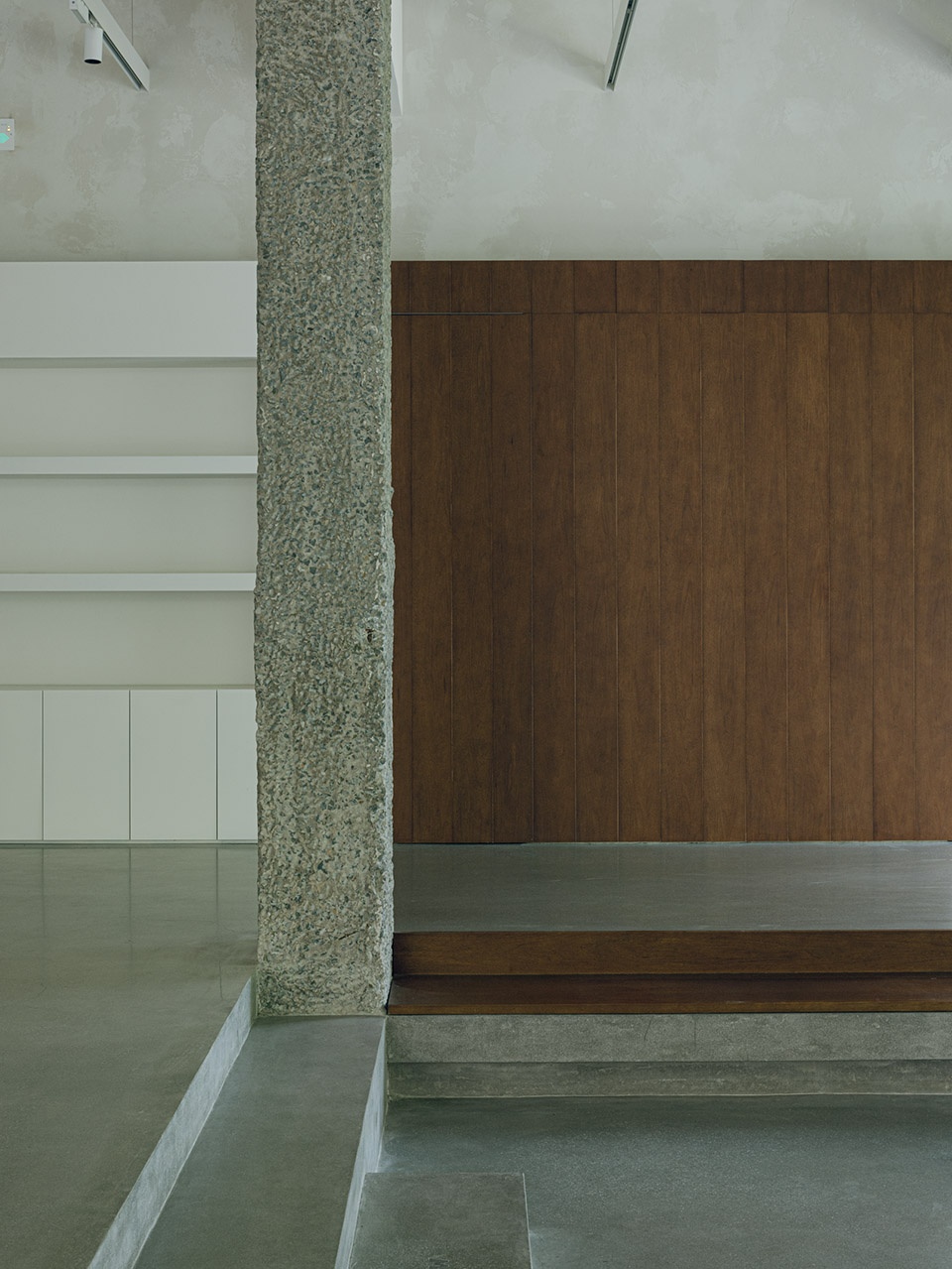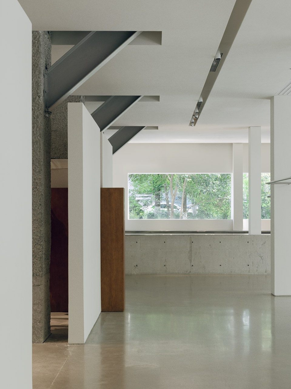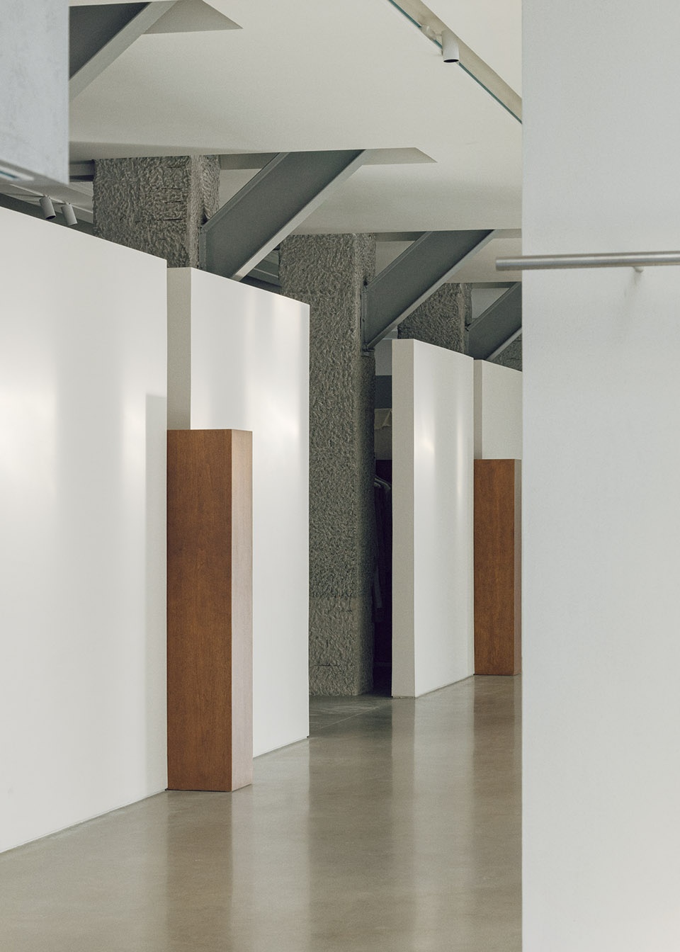 Adjacent interior columns retain their raw concrete finish, deliberately distanced from white-plastered walls and ceiling planes to preserve spatial autonomy. Roof-supporting steel I-beams, arranged in rhythmic intervals, celebrate industrial pragmatism. These preserved relics, juxtaposed with contemporary interventions, narrate a dialogue between past and present.