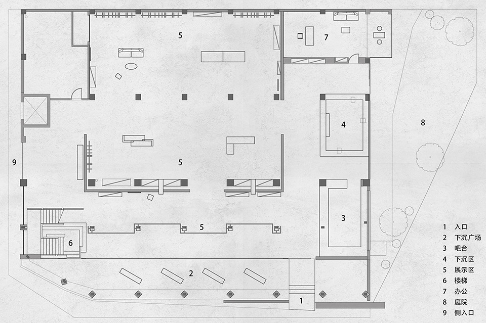 ▼形成下沉式的开放区,form a sunken forecourt