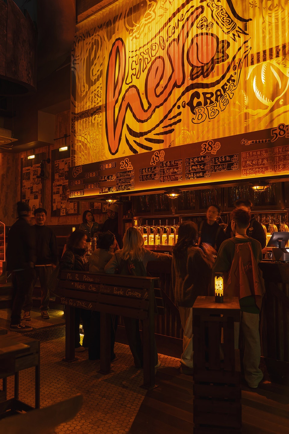 The huge facade is the most intuitive image of the brand. It is designed with Polycarbonate panel and a giant hand-painted logo, and an auxiliary graphic of “beer tap” is added in the upper right corner to directly convey the personalized atmosphere of the brand and products to the guests in the distance. The store adopts a surrounding high and low staggered layout, which not only provides different drinking experiences for drinkers but also serves as an excellent social stage.