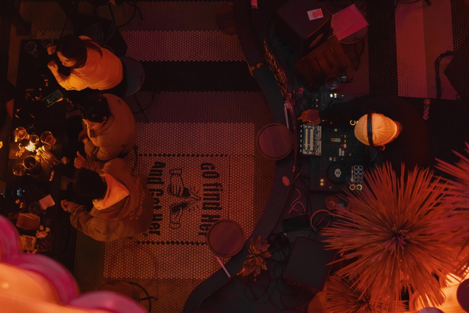 The DJ booth is placed at the corner of the spiral staircase. The fitted high and low DJ booth design leaves just enough space for the stage area, and also allows for two DJs to play B2B music at the same time.