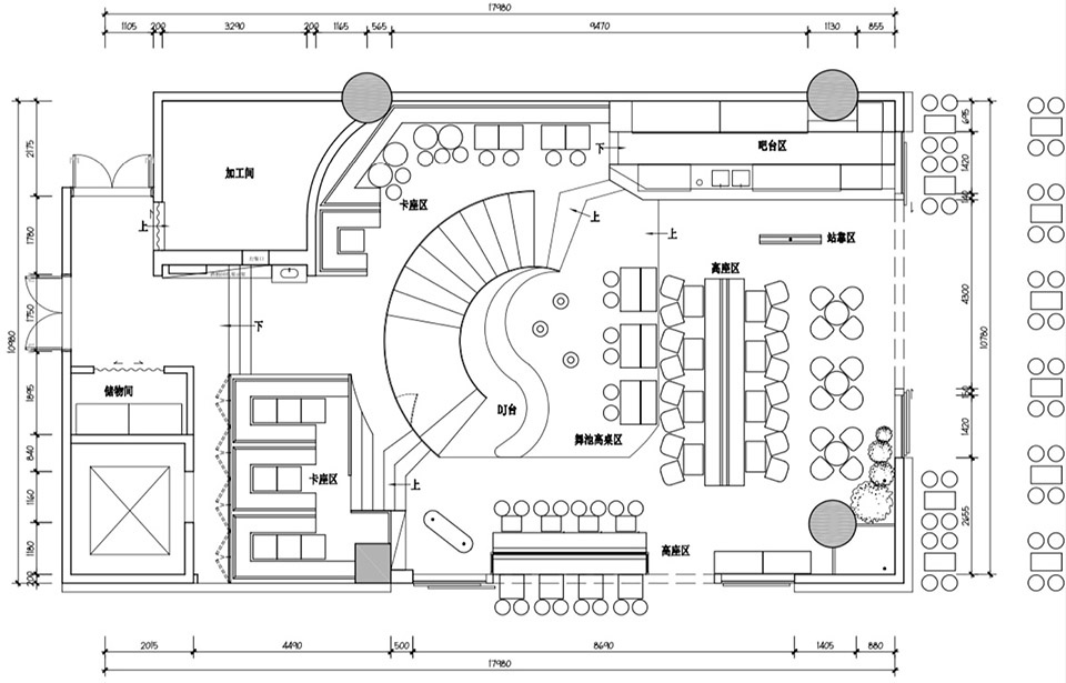 DJ台放置在了旋转楼梯的转角处,贴合式设计的高低dj台恰到好处地给蹦迪区留出了紧凑的空间。同时也为2位dj同时B2B打碟留出了可能性。