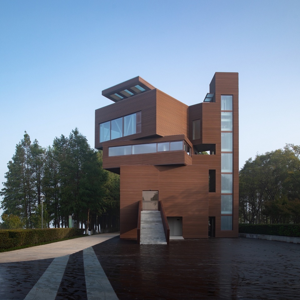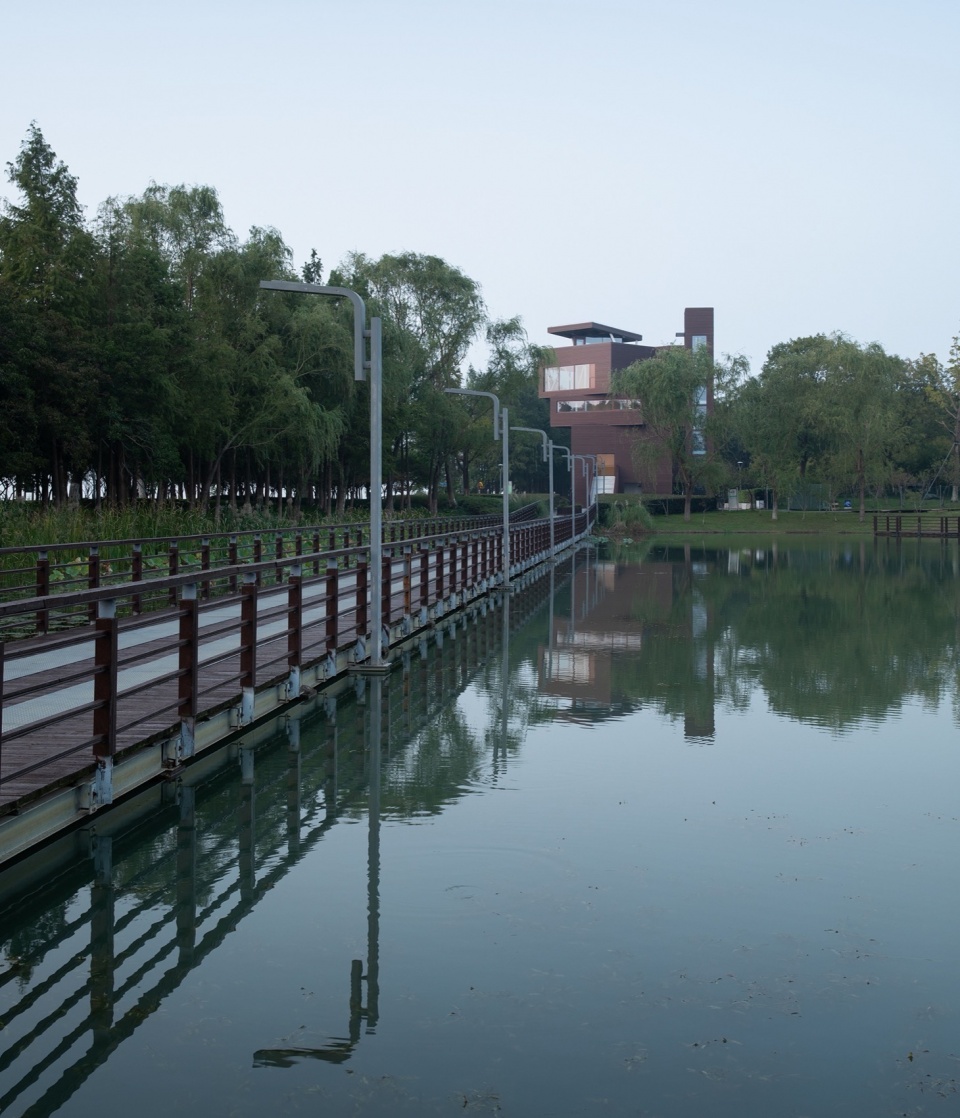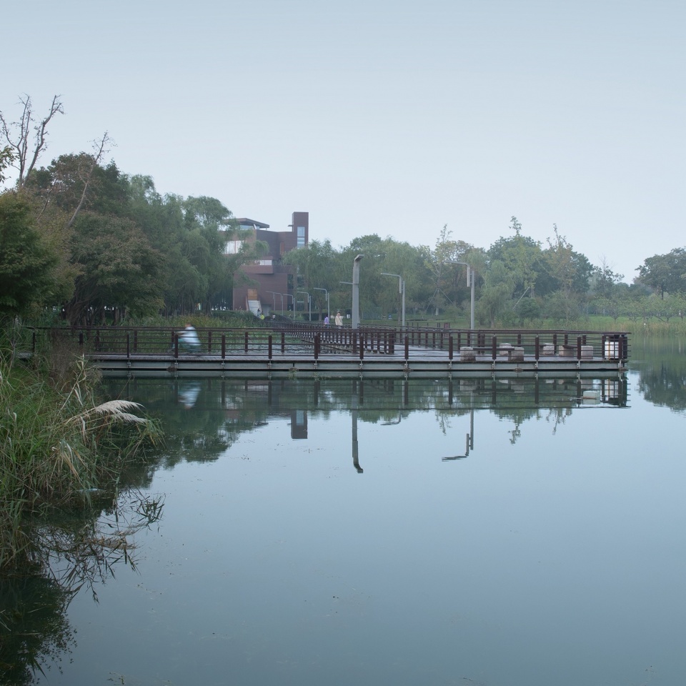 项目位于阳澄湖东侧昆山的夕露园里,从这里既能看到公园景观、阳澄湖的宜人风光,又能远眺城市风景,同时作为公园游览线路的一部分承担了公共建筑的功能。