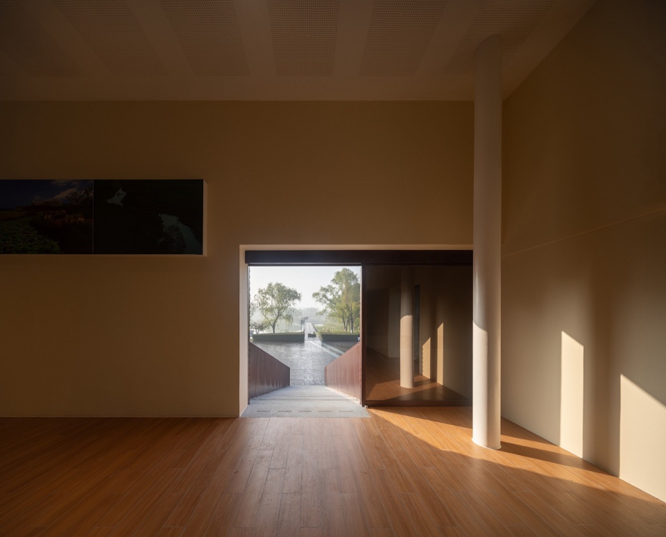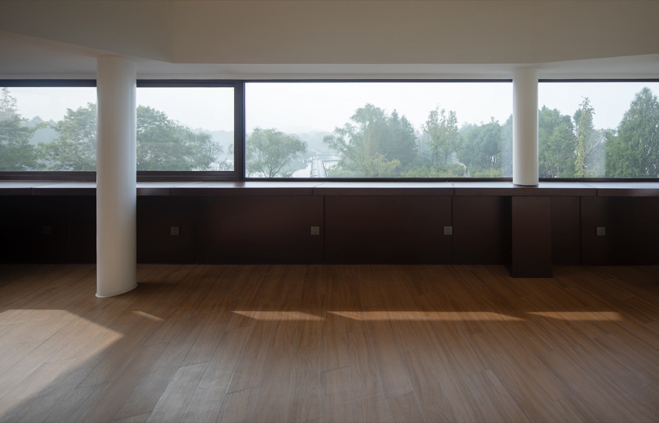 The exhibition hall (Second floor), the café (Third floor), and the tea room (Fourth floor) all share a conceptual link through the window’s shifting designs, reshaping to match each room’s function and landscape. Entering the exhibition hall, the windows frames a picture of water. The design language of the door corresponds to the path of entering, while window corresponds to landscape. Although being a vast lake, only a small part can be seen in a more subtle way in the exhibition hall, and what’s more, the design of window completes the interaction between indoor and outdoor fields.
