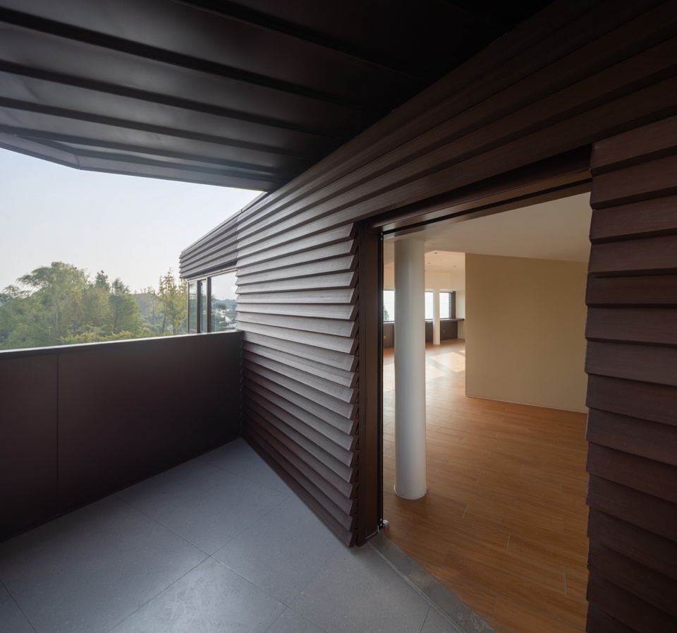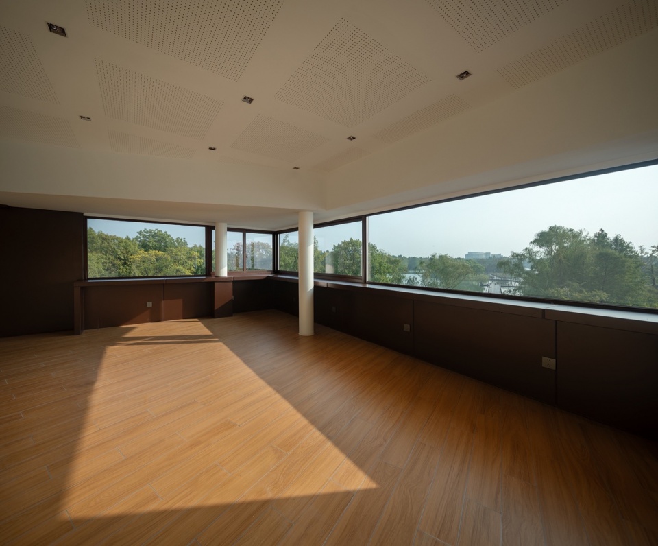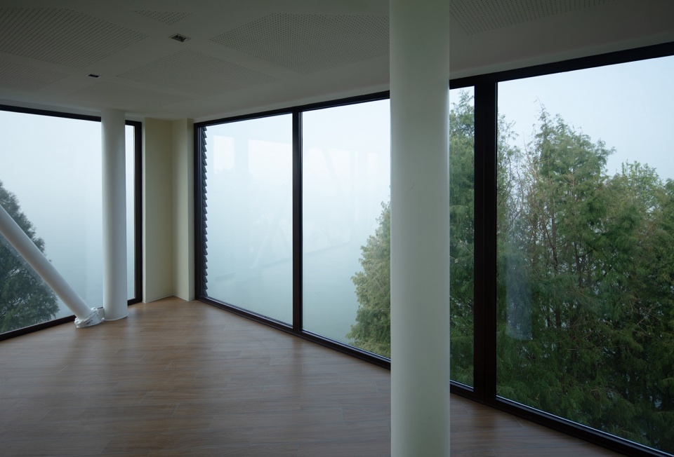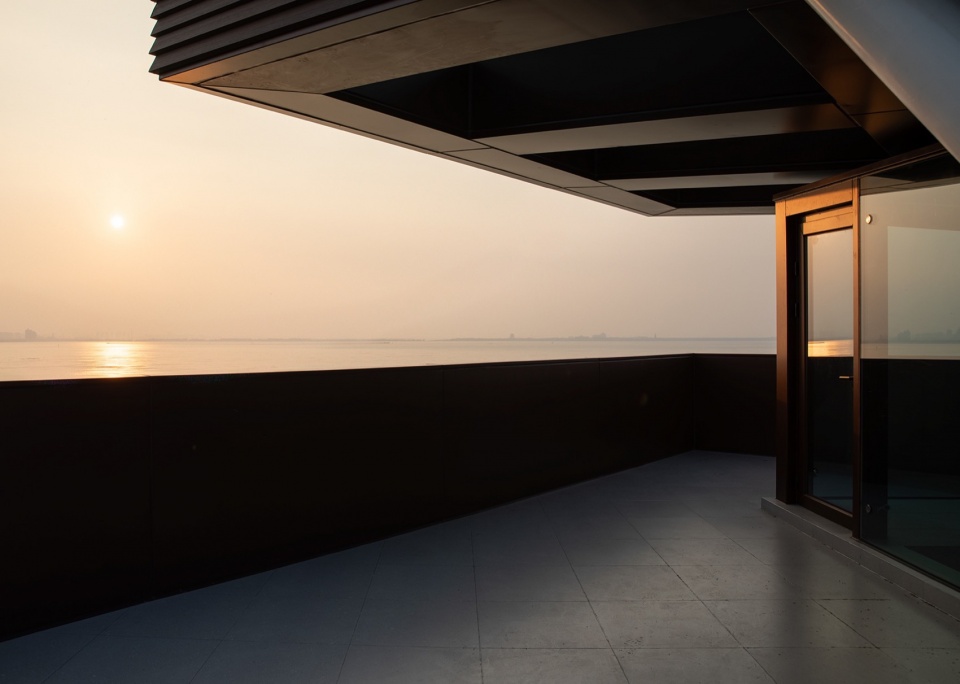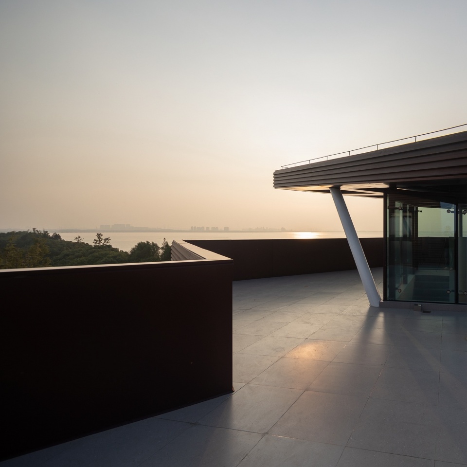 The rooftop is specially set up for viewing while balustrades are carefully considered to block the content below the water surface that leaves a pure view. In addition, the westward geographic orientation of the building makes it a perfect view for sunset. Ascending by the observation tower, while the architectural form rotates by floor, it brings unique experience of function and scenery on different horizon.