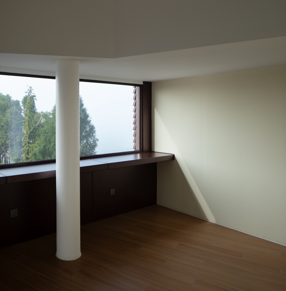 随着建筑体固定角度的分层转动,来到三层时透过窗户见到整个公园景观,水面被刻意隐藏。这一层空间功能设定为咖啡店,L型窗户以整排长条形态呈现,将丰富内容的公园景观以及远眺可见的城市风貌纳入观赏动作中,并配置可作为“咖啡桌”使用的窗台。在这里,每个人都可以有独享风景的座位。
