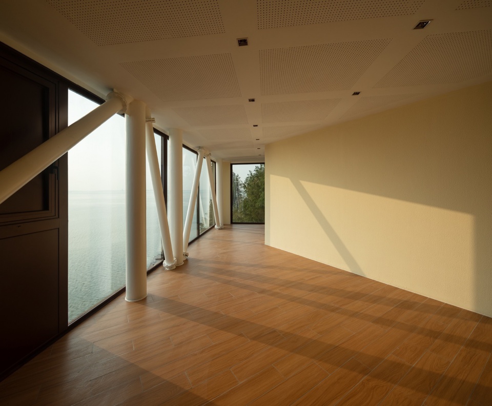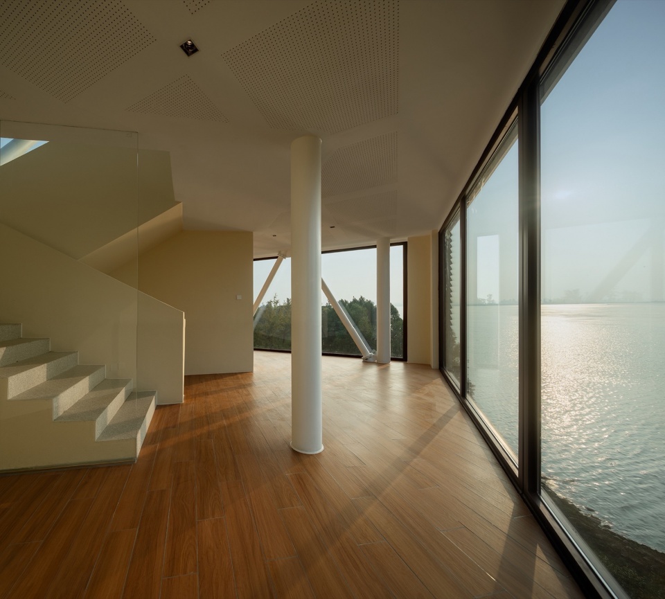 在建筑顶部的屋面空间同样进行了观景设置,专门搭建的栏板将视野中水面以下内容全部屏蔽,留下纯粹的水面和岸线,另外,西向的地理方位使这里成为难得的落日观赏点。随着在瞭望塔中不断登高,对应建筑形体逐层转动,人们在不同楼层都接收到独有的功能与风景相结合的体验。
