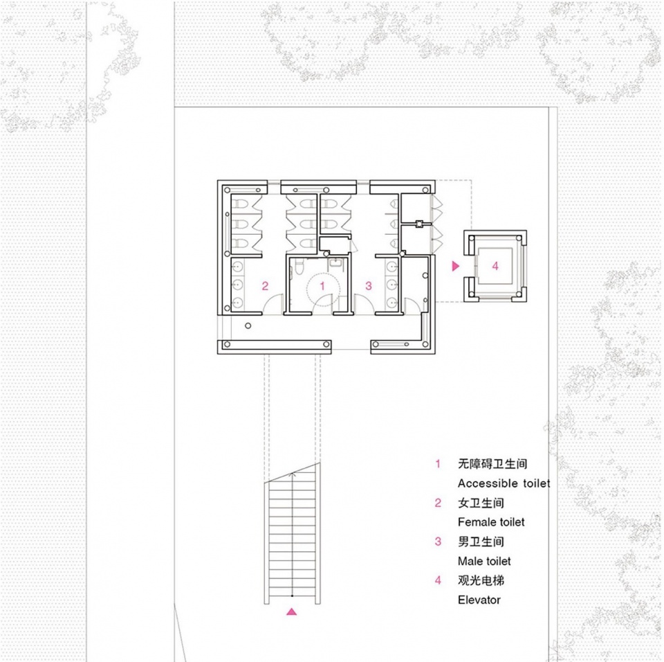 瞭望塔的底层设置全天开放的公共卫生间,供游人使用。与卫生间方形门洞同侧的长台阶提示游览路线,沿着它拾级而上便来到建筑二层。