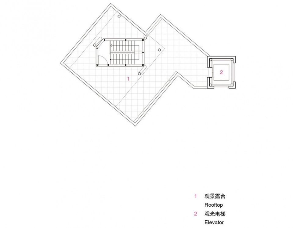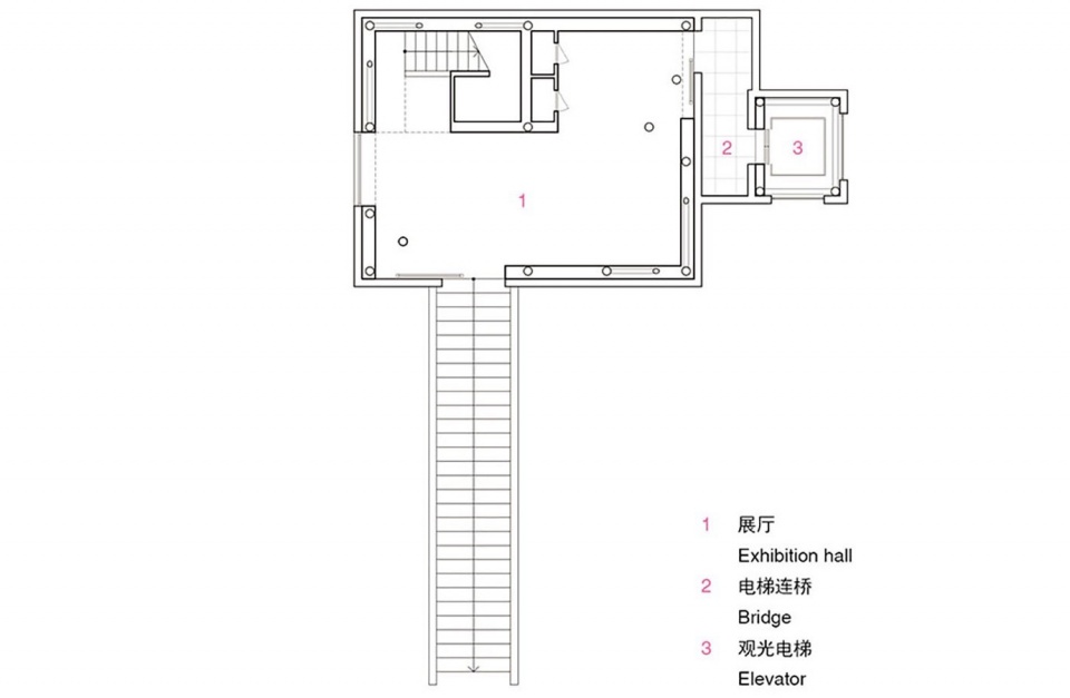 由步梯通行于塔中之外,另一种游览路径的选择是搭乘设置在建筑东侧的观光电梯。通过将连接电梯与建筑之间的空间进行变化——二层的空间变成“小院子”,两米高墙体四面围合形成室内感,同时上部留空营造出室外感受;四层采用全室内的处理方式,亦不同于三层常规的连接桥设计——乘坐电梯的动作被赋予探索的小乐趣,当门打开时进入到不同形态空间的惊喜瞬时生成。