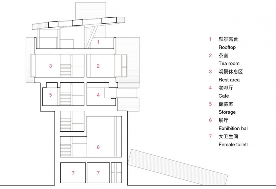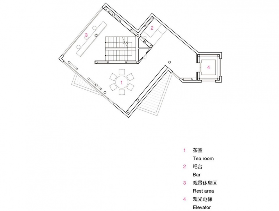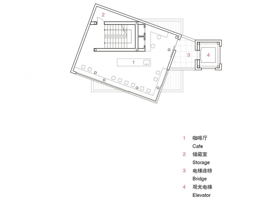 Besides stairs, it is also available to take the observation elevator on east side of the building. By the changing of lift lobby on each floor: a “small courtyard”(Second floor), two-meter-high walls enclosing the space to creates indoor sense, while the upper part outdoor. On the other side, the fourth floor is fully indoor, unlike the conventional bridge design on the third floor, that the elevator tour gives a little pleasure of exploration and instantaneous surprise of entering a different space.