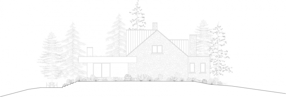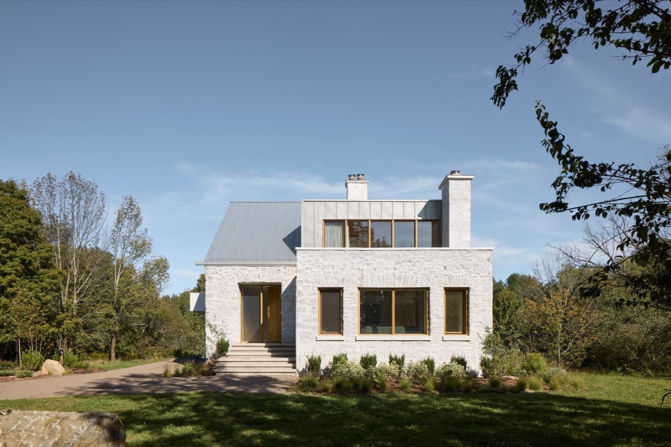 本项目隐藏在魁北克东部乡镇(Eastern Townships)如画的自然风光中,是对一座20世纪早期石头住宅的全面改造与扩建。这栋房屋最初建于1908年,在1950年代曾有过小幅扩建,但自那之后几乎未曾变化。厚重的墙体、笨拙的体量和超大尺寸的烟囱,使其更像一座小型庄园,而非传统乡村住宅。内部,小窗户和异样的布局让空间显得局促而狭窄;外部,风格不一的石墙通过显眼的灰色水泥砂浆连接在一起,削弱了石材本身的自然美感。