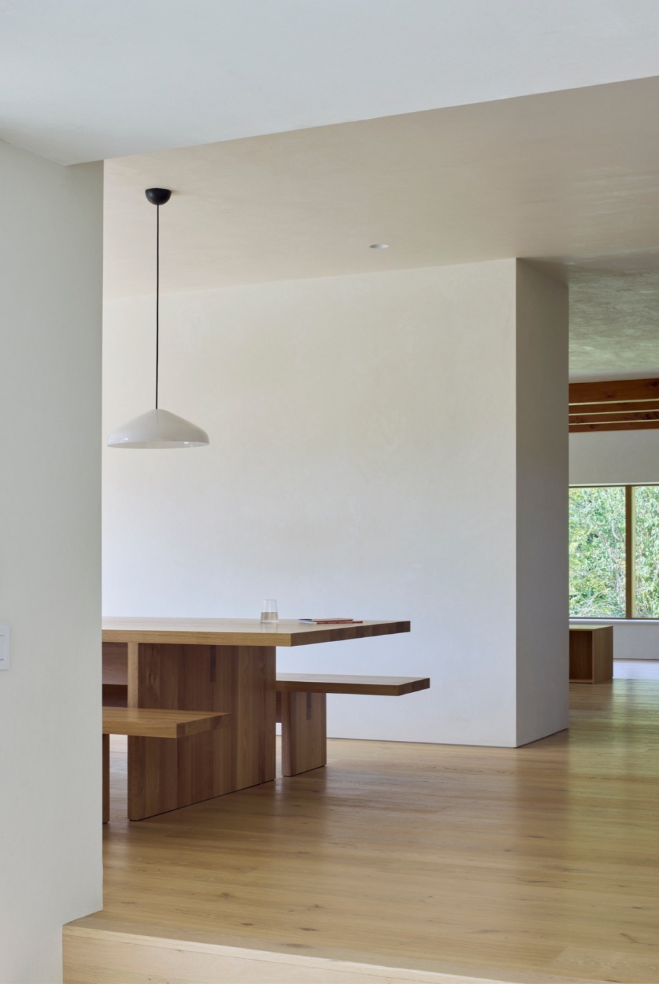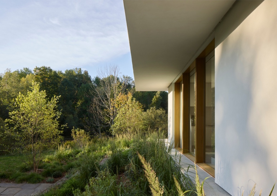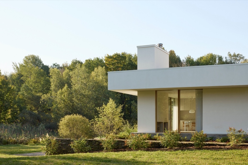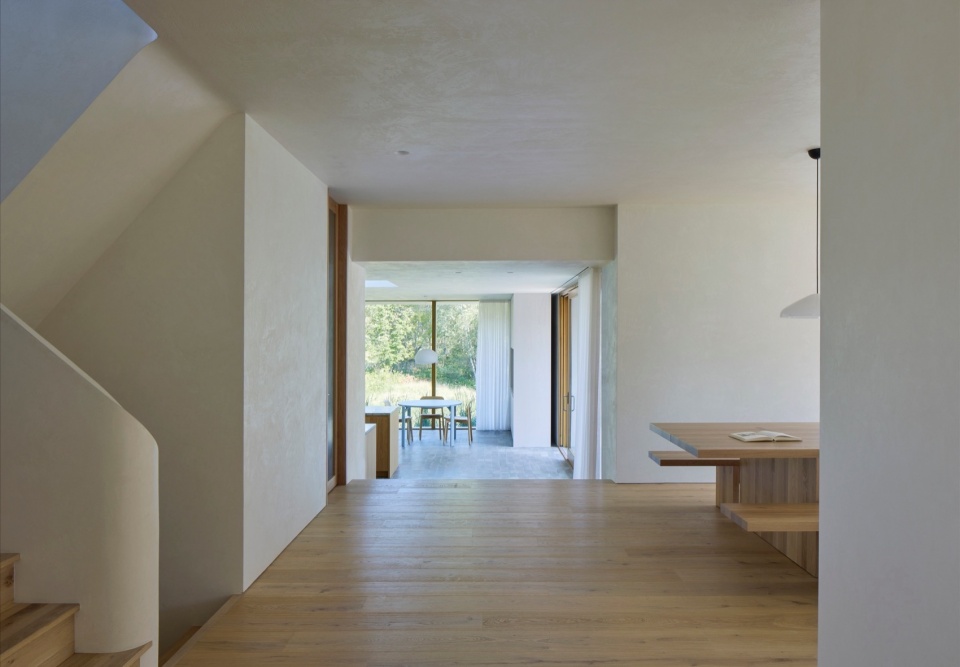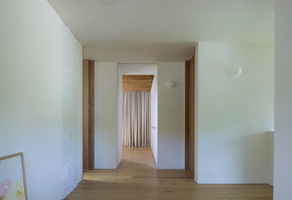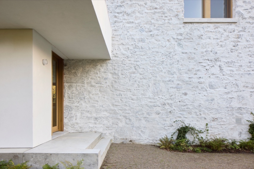 材料语言是设计的另一关键方面。为了让整座建筑形成统一的视觉语言,设计团队开发了一种定制的白色水泥矿物涂层,覆盖在新旧外墙及室内墙面之上。这种混合了石灰与水泥的涂层与当地工匠密切合作完成,既统一了各区域的视觉效果,又让背后的材质质感若隐若现。这种细腻、富有触感的表面处理会随着时间推移自然风化,夏季时,亮白的外墙在郁郁葱葱的绿意中格外醒目;而到了冬季,建筑则仿佛消融于雪白的单色风景中,呈现出一种近乎虚幻的存在感。