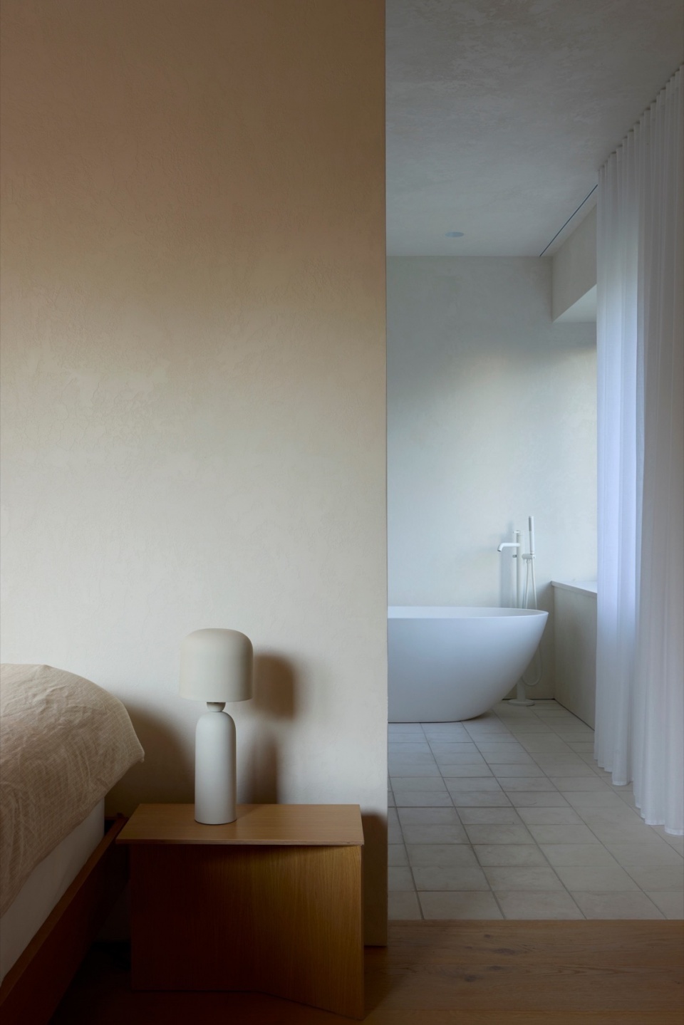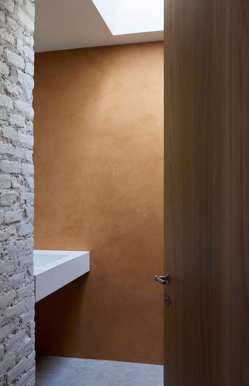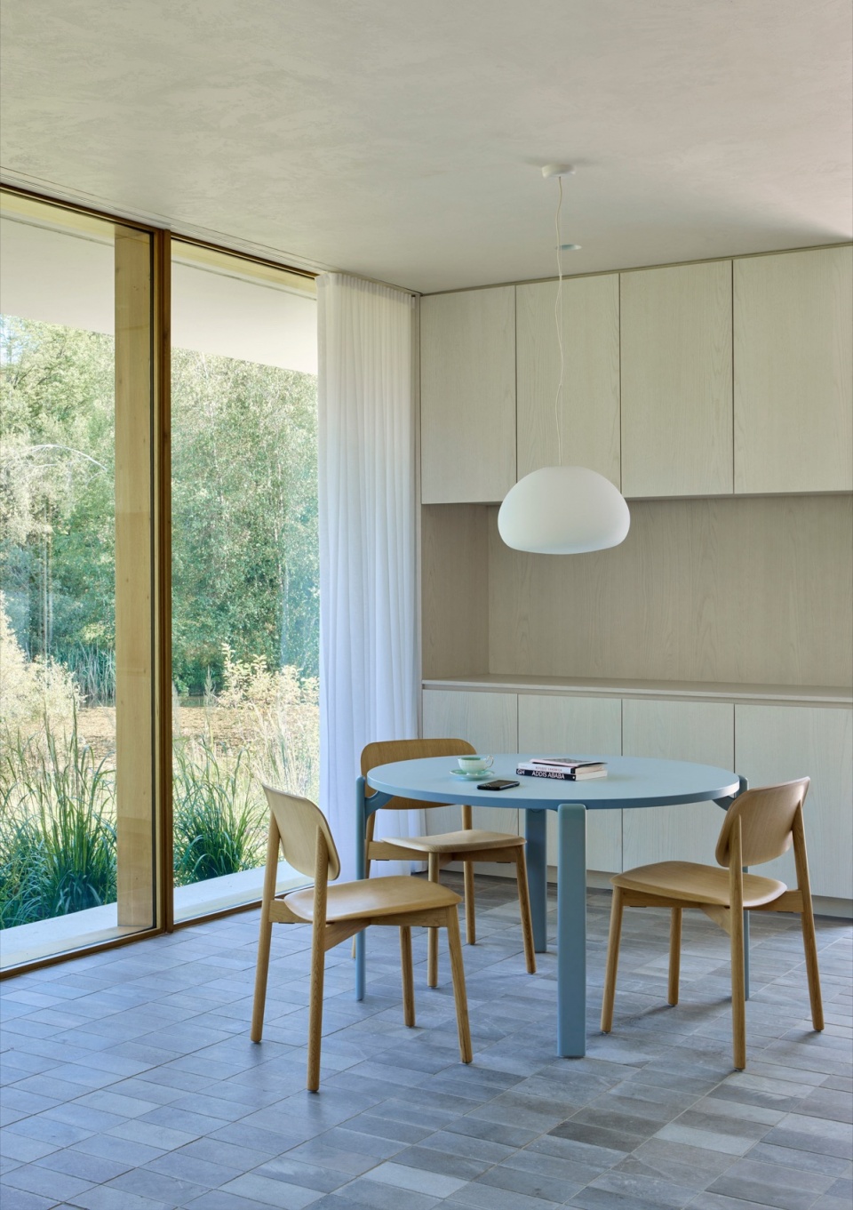 材料语言是设计的另一关键方面。为了让整座建筑形成统一的视觉语言,设计团队开发了一种定制的白色水泥矿物涂层,覆盖在新旧外墙及室内墙面之上。这种混合了石灰与水泥的涂层与当地工匠密切合作完成,既统一了各区域的视觉效果,又让背后的材质质感若隐若现。这种细腻、富有触感的表面处理会随着时间推移自然风化,夏季时,亮白的外墙在郁郁葱葱的绿意中格外醒目;而到了冬季,建筑则仿佛消融于雪白的单色风景中,呈现出一种近乎虚幻的存在感。