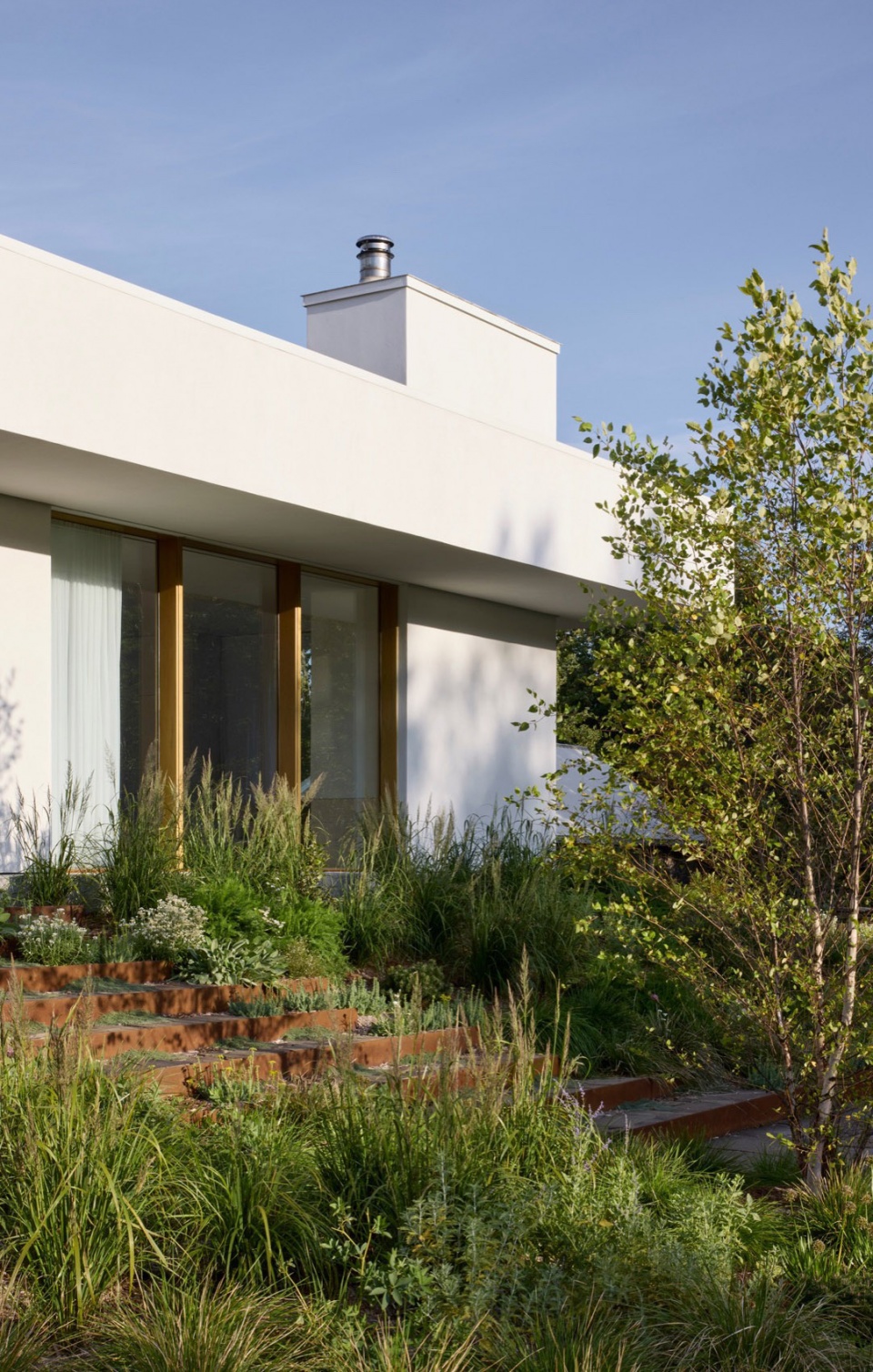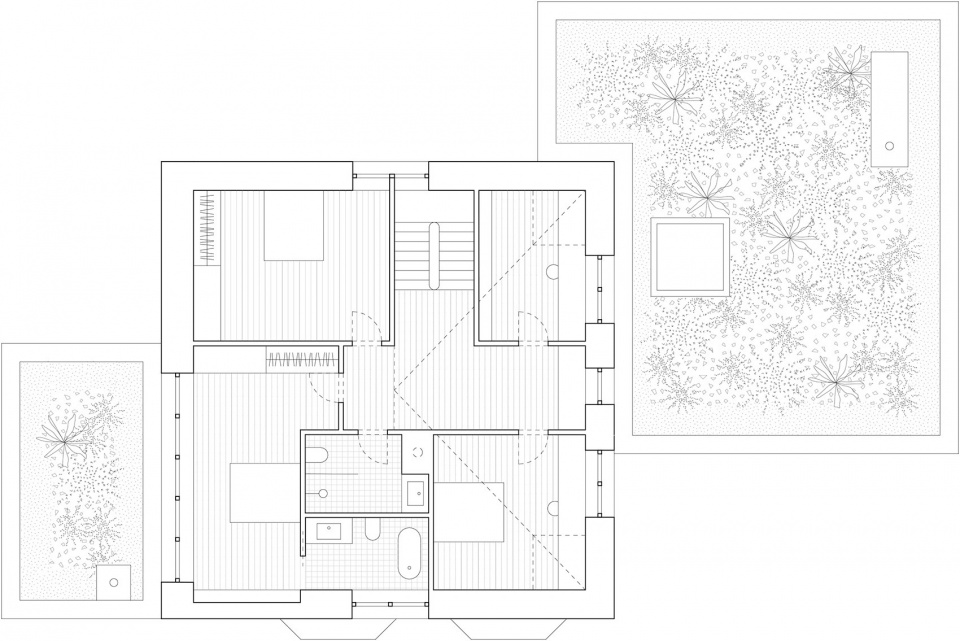 扩建部分的一层墙体和屋顶同样厚重深邃,呼应了原建筑原始、厚重的特征。三组独立的体块内设有储藏空间与壁炉,同时框景式地引入周边自然景色,并支撑起一片大尺度悬挑屋顶,将室内生活区自然延伸至多个露台、小径与花园。扩建部分低矮水平的轮廓线,确保了原有坡屋顶的完整性和清晰辨识度。在上层空间,一座全玻璃屋顶老虎窗打开于原有扩建之上,成为当代介入与内部彻底变革的明确标志。房屋后侧,新建的高大烟囱突破屋顶线,呼应原建筑中两座分别代表不同建筑时期的烟囱,进一步强化了整体叙事的连贯性。