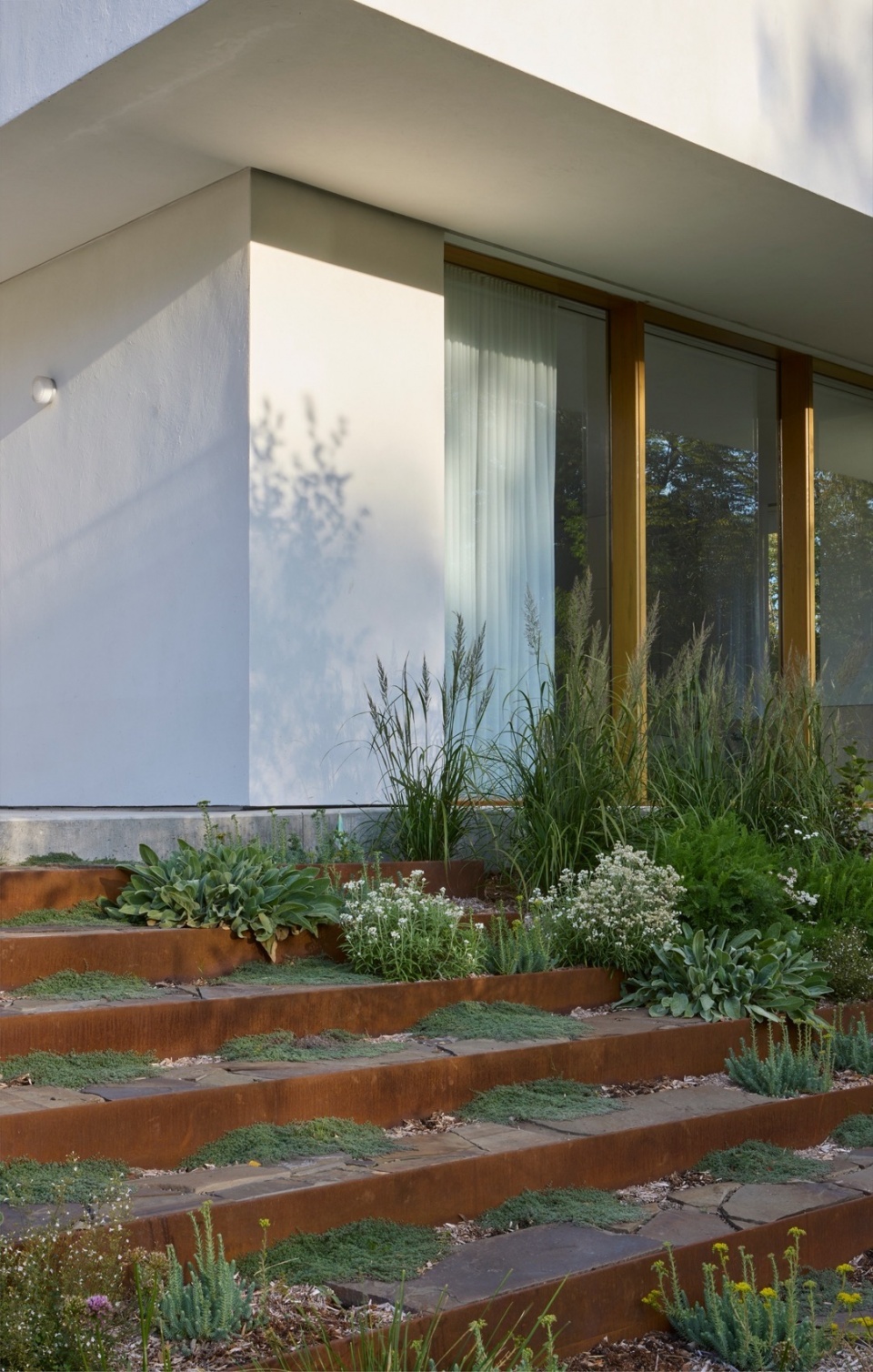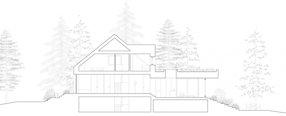 住宅通过一系列简单的被动式策略来降低能耗,并在全年保持舒适的室内气候。原本大部分裸露在地面的地下室,随着扩建部分的加入而大部分“下沉”至地面以下。周边地形也通过缓坡处理,减少了挖土量,降低了地下室外墙的暴露程度,同时也使建筑更自然地融入环境。地面层的阶梯式布局不仅缩小了建筑整体占地面积,还形成了自然向上的气流通道。夏季时,这种布局有助于自然通风;冬季则通过高效热回收系统,将温暖空气回收再分配到各个空间。