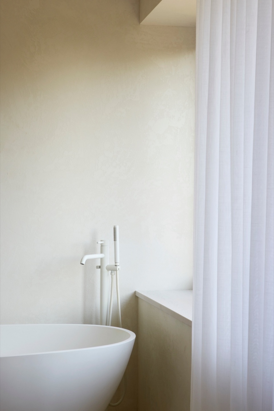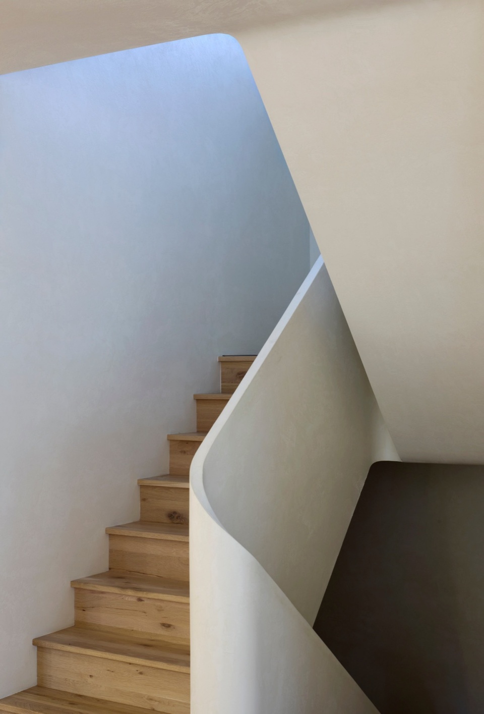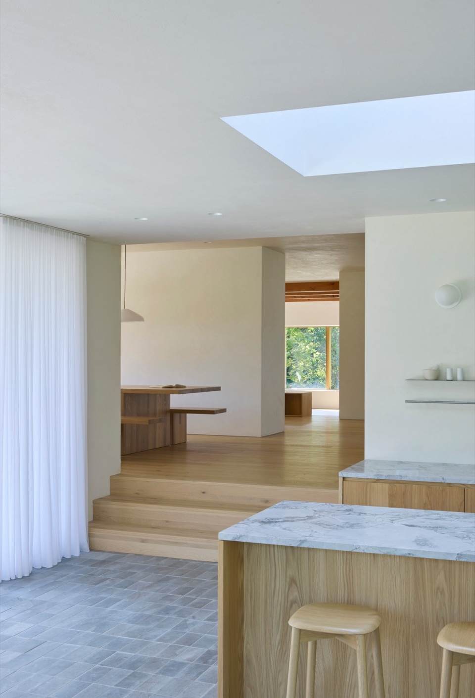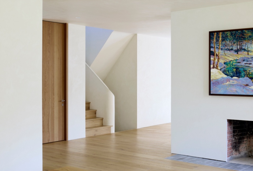 Another key aspect of the design is materiality. To produce a cohesive visual language throughout the house, the firm developed custom white cementitious coatings that cover all facades, both old and new, as well as all the walls inside the house. These assorted white mineral finishes unify the different areas of the house, while still allowing the material texture behind to come through. These lime and cement coatings, developed in close collaboration with local artisans, provide a subtle, tactile finish that will continue to patina over time. They also give the house a very different expression depending on the season: in the summer, the bright white facades stand out against the lush greenery that surrounds the house, while in winter, the house fades into the snowy monochromatic landscape in an almost evanescent way.