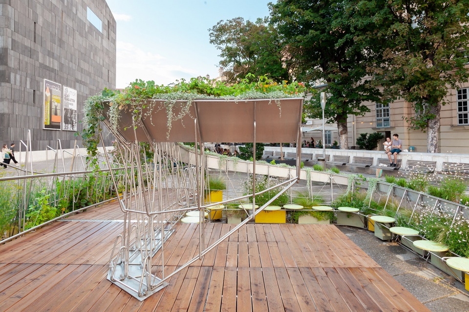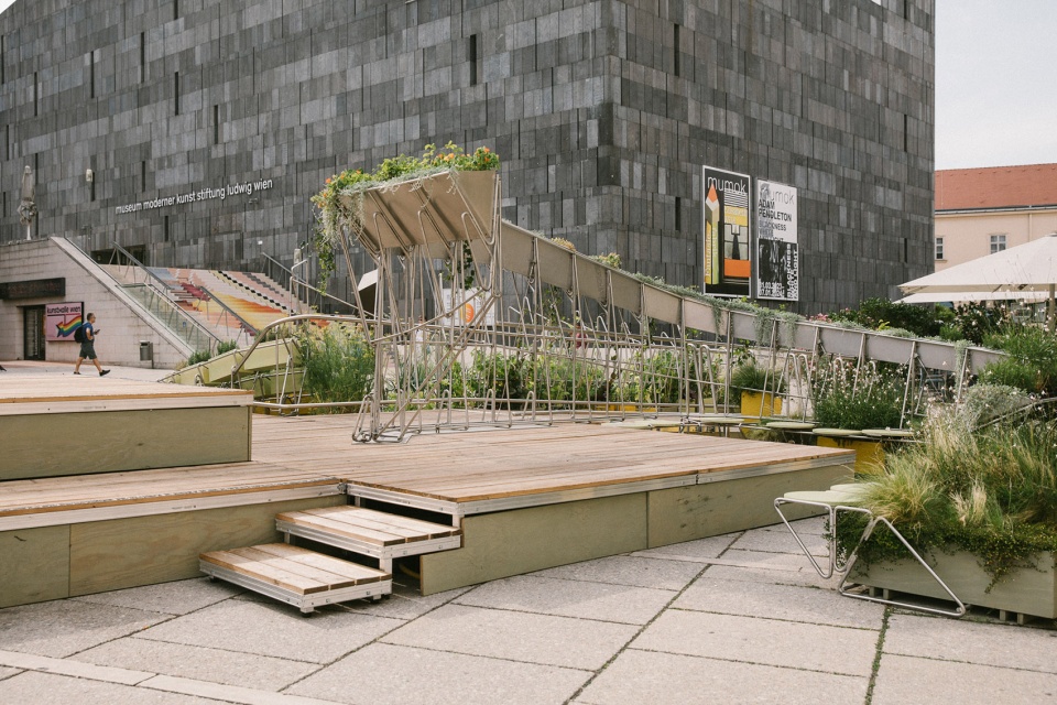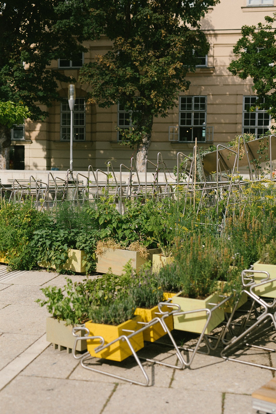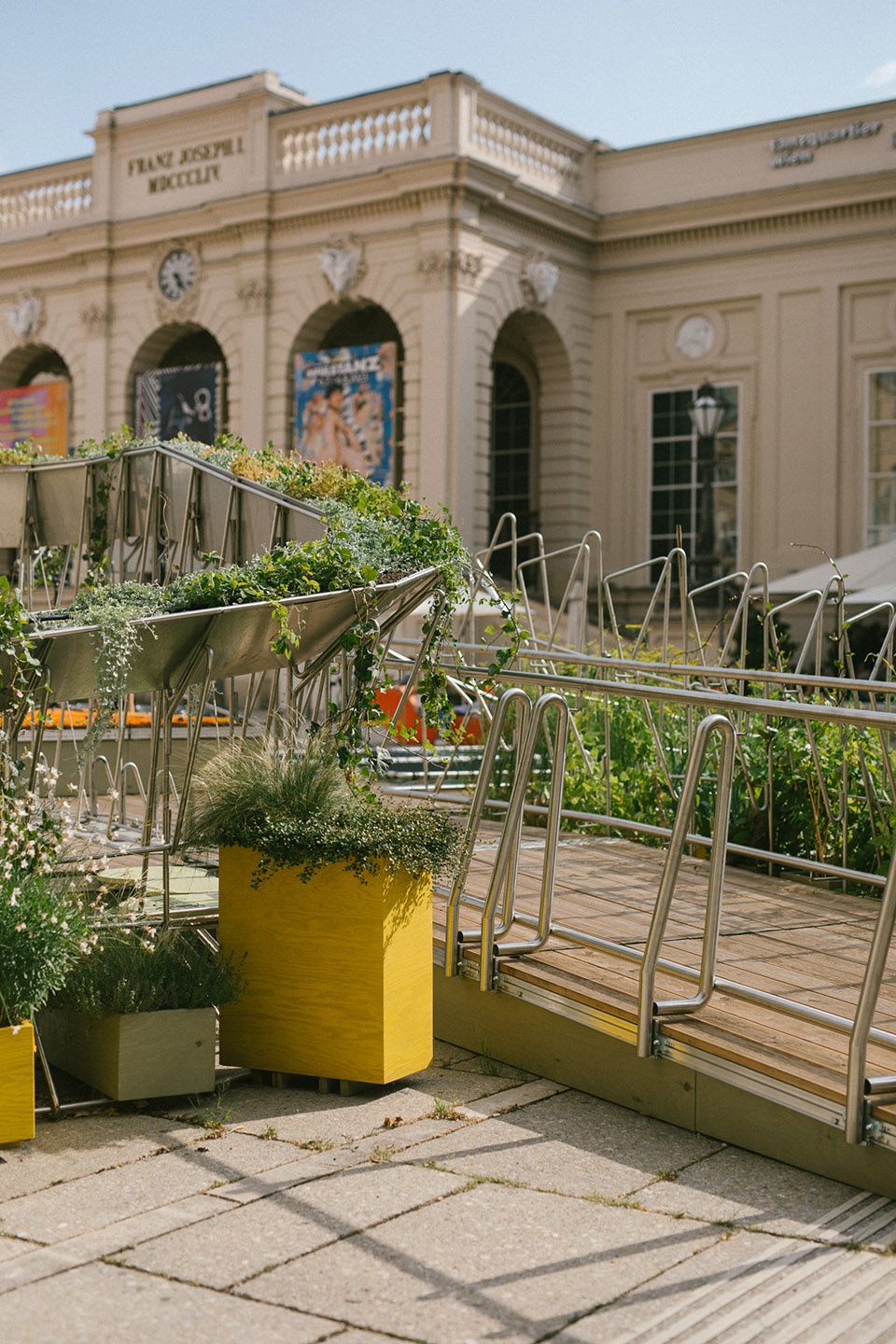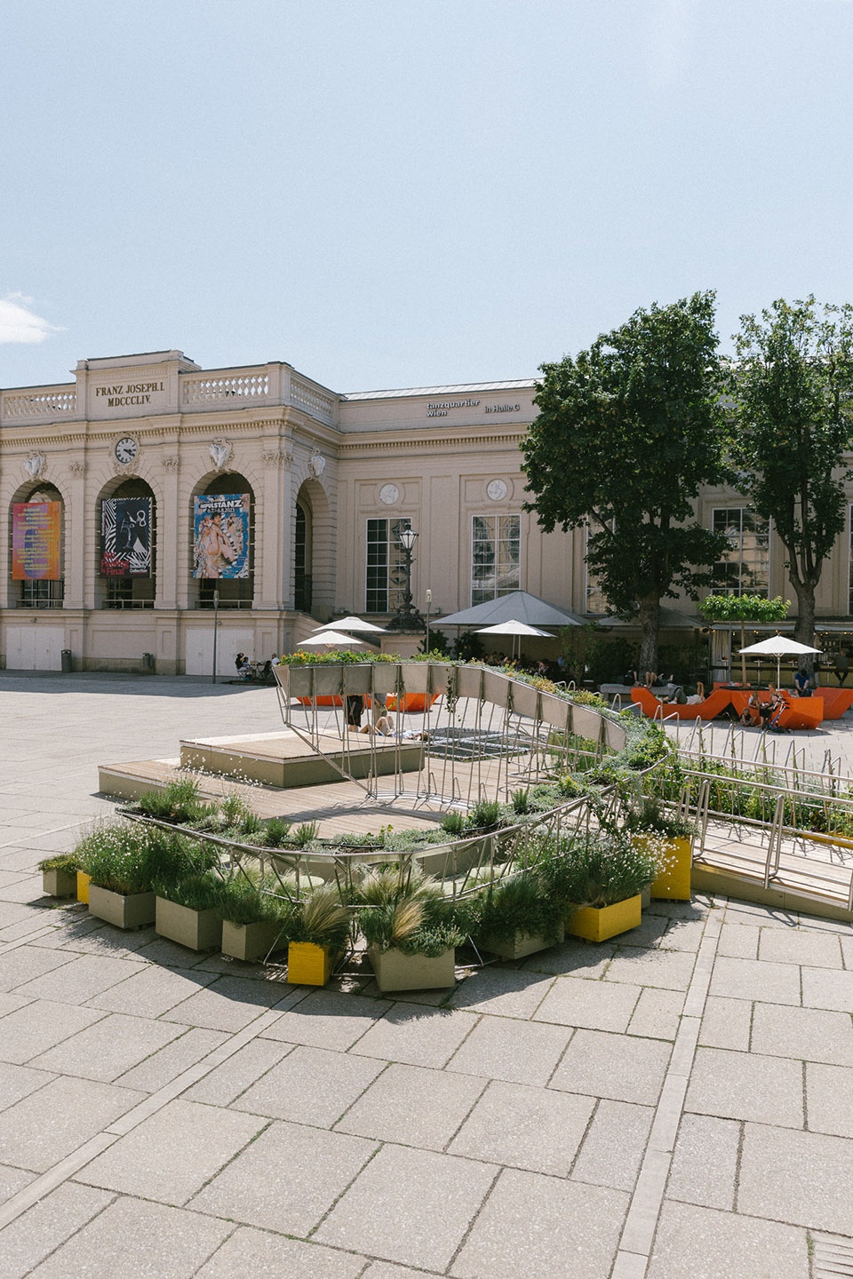 这座植物展台作为一个充满活力与多样性的存在,是沟通与艺术表达的平台,它不断演变,塑造着未来的价值观与内容。其设计理念在于拥抱时间与空间上的持续变化,通过人与自然、科技之间的和谐共融实现。位于城市核心地带的Sommerbühne,不再仅仅是一个展示空间,而是转化为一处供人相遇与休憩的场所,成为城市中的长期存在。此处的可持续性不仅体现于简约的设计和公共对话,更体现在现场所激发的集体经验共鸣中。为应对夏季高温所带来的地面过热问题,设计特别引入了密集的绿色植被,激活了原本被硬化混凝土覆盖的大型庭院空间。