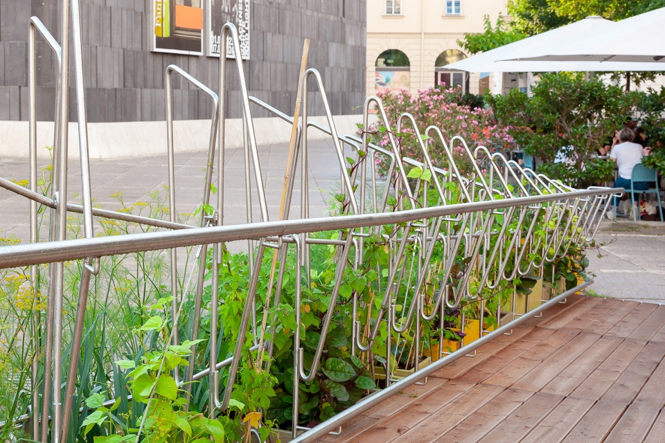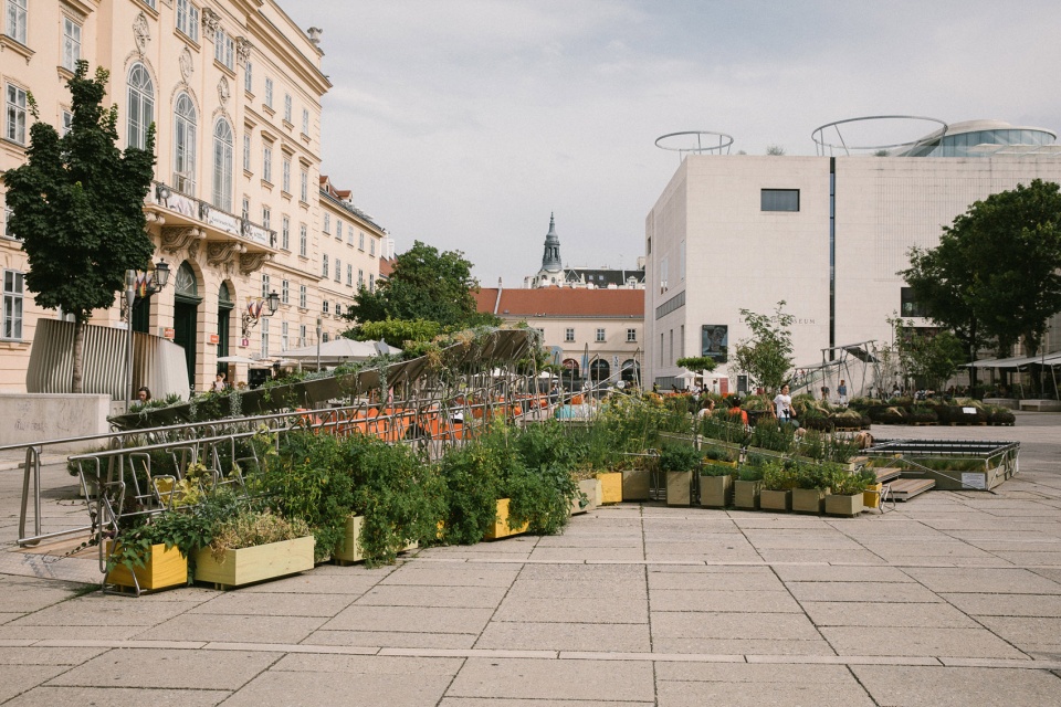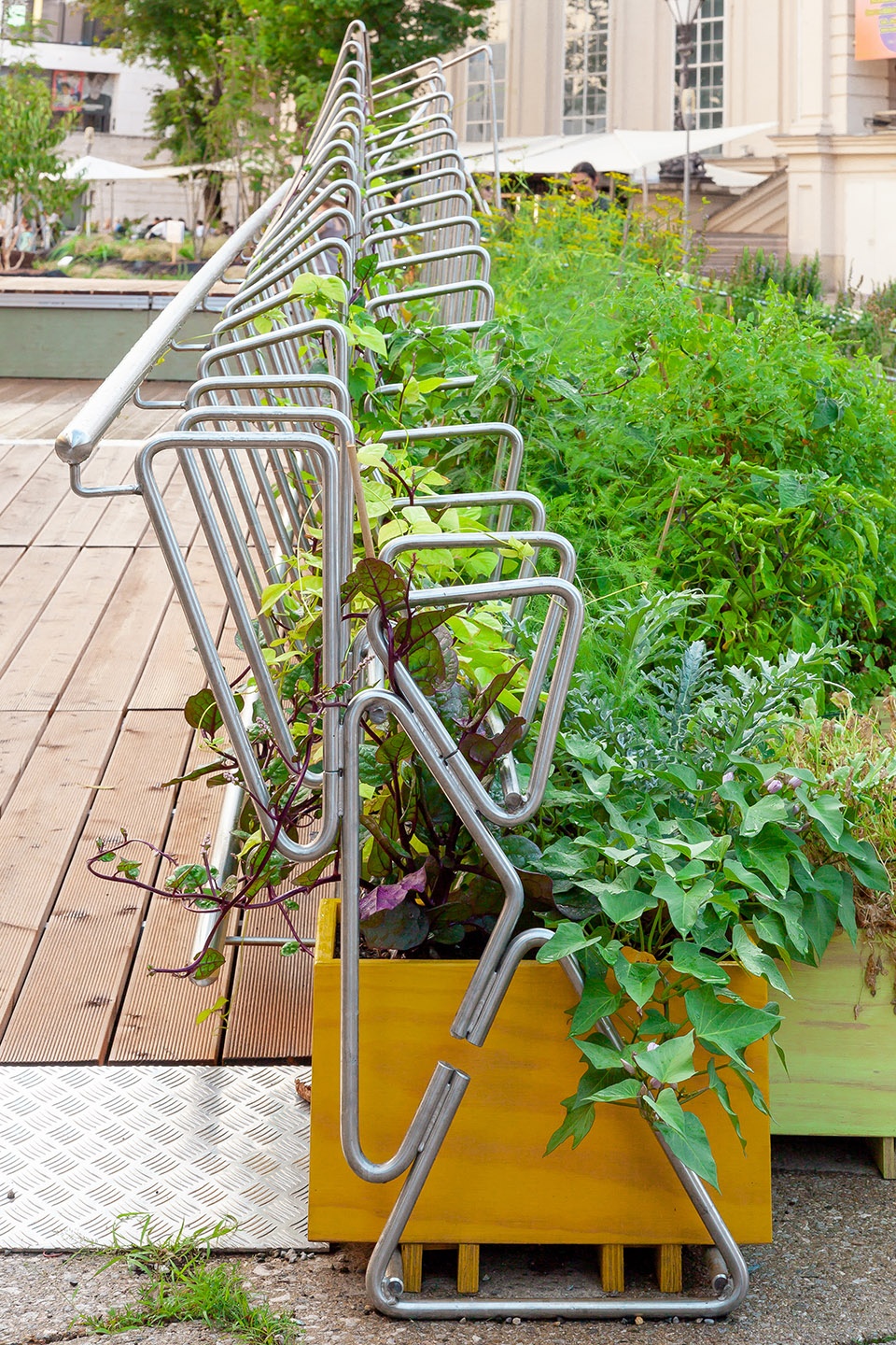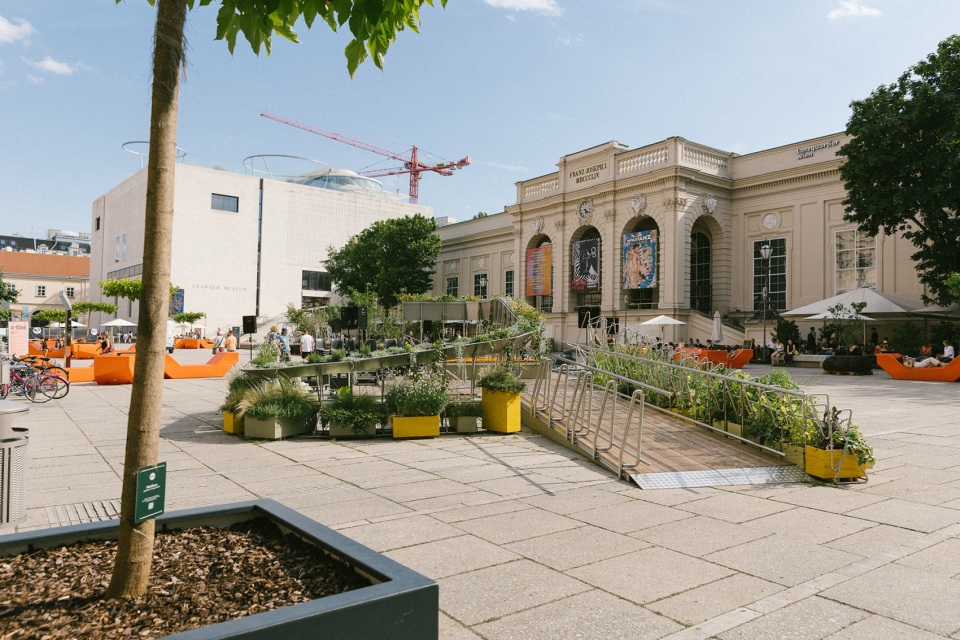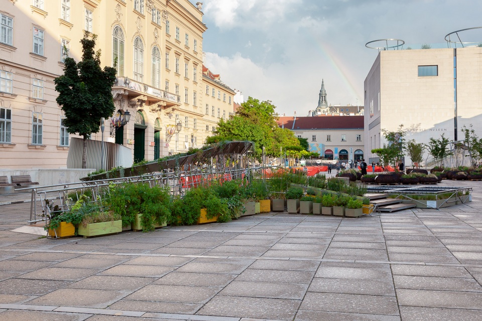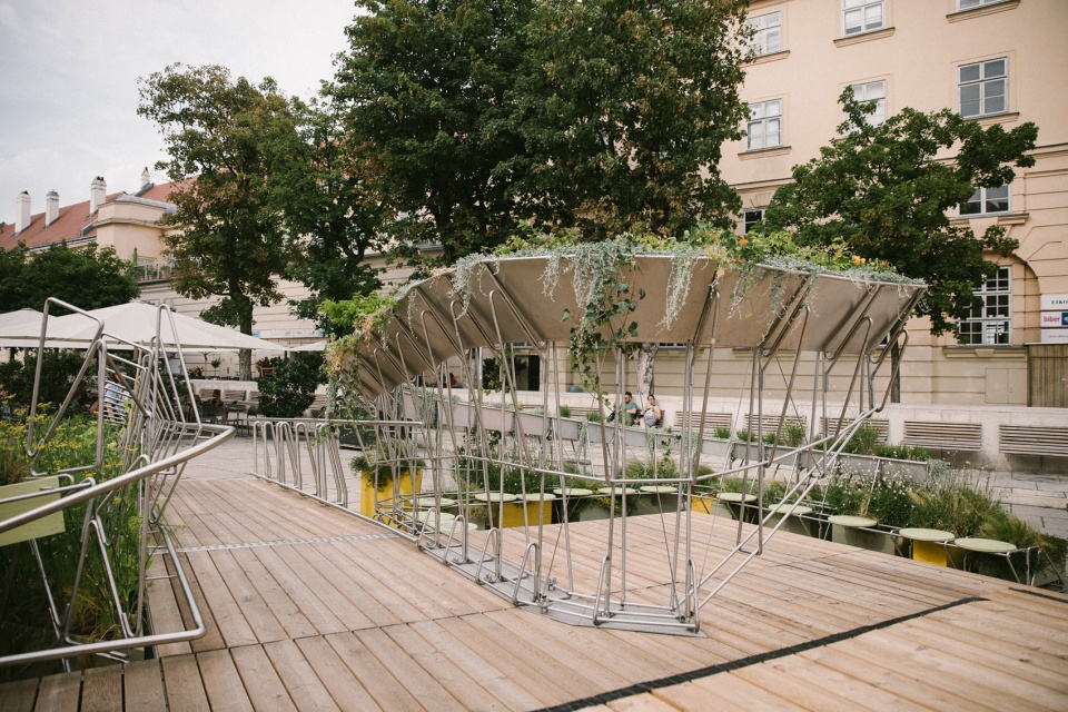 这座植物展台作为一个充满活力与多样性的存在,是沟通与艺术表达的平台,它不断演变,塑造着未来的价值观与内容。其设计理念在于拥抱时间与空间上的持续变化,通过人与自然、科技之间的和谐共融实现。位于城市核心地带的Sommerbühne,不再仅仅是一个展示空间,而是转化为一处供人相遇与休憩的场所,成为城市中的长期存在。此处的可持续性不仅体现于简约的设计和公共对话,更体现在现场所激发的集体经验共鸣中。为应对夏季高温所带来的地面过热问题,设计特别引入了密集的绿色植被,激活了原本被硬化混凝土覆盖的大型庭院空间。
