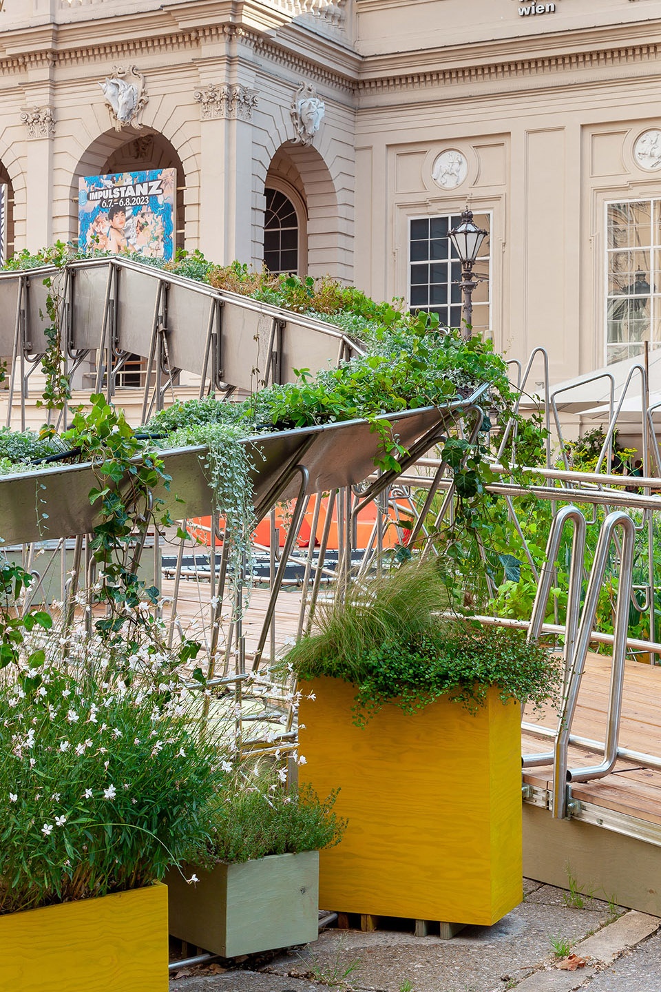 The Sommerbühne is in a continuous transformation driven by a future-oriented selection of durable, flexible materials, climate-resilient vegetation. Over time, the initially separate materials blend to form a symbiotic structure. The stage, as an ecosystem, communicates differently throughout the day and gradually evolves with each passing day.
