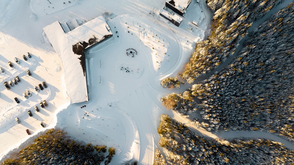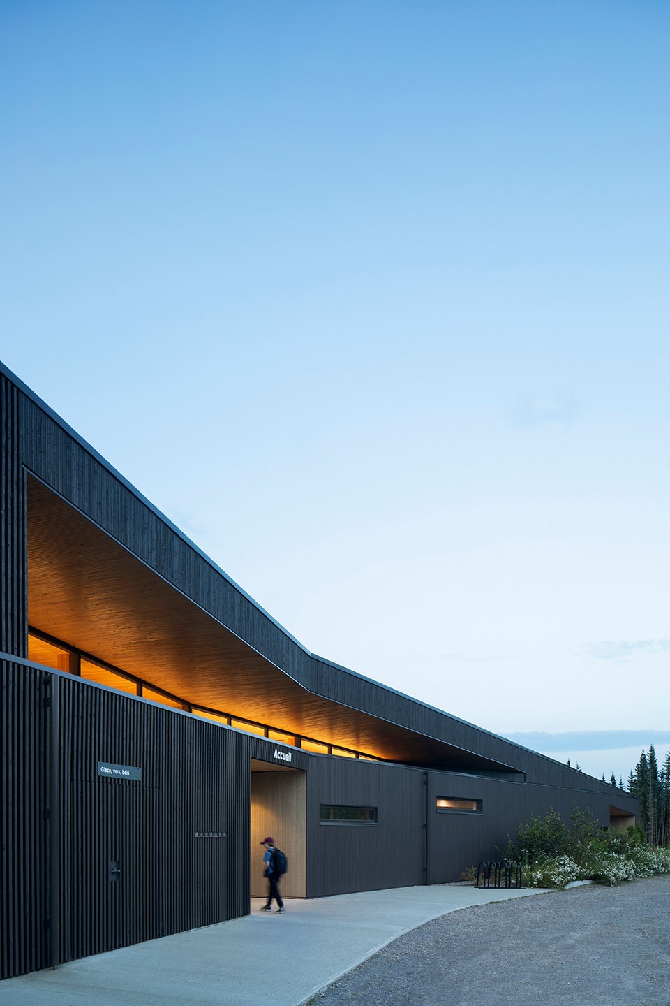 The design of the pavilion evokes the old logging camps, with its wooden structure, simple volume, and low-slope roof. The lines of the dark spruce cladding, installed vertically, recall the grain of cut timber. The subtle play of fullness and voids from the openings in the wooden envelope of the building creates dynamic shadows, which shift throughout the day in response to the sun’s path.