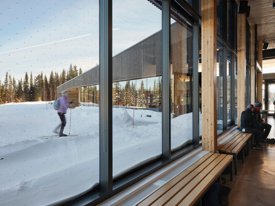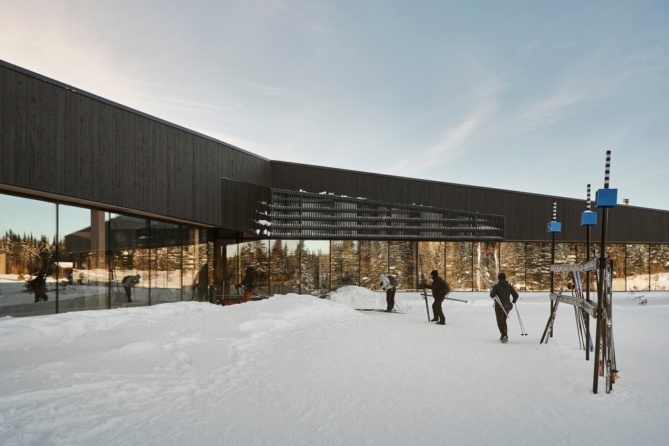周围的自然景观自然延伸至建筑内部,通过绿植坡地,在冬季成为滑雪嬉戏的场所,同时打造了自然露天剧场,设有休憩区和户外火炉。设计中特别考虑了滑雪爱好者的需求——作为场地的主要使用者,新接待馆被设置得更靠近滑道,并根据风向优化了朝向,以提供更好的防风效果并最大限度地引入阳光。