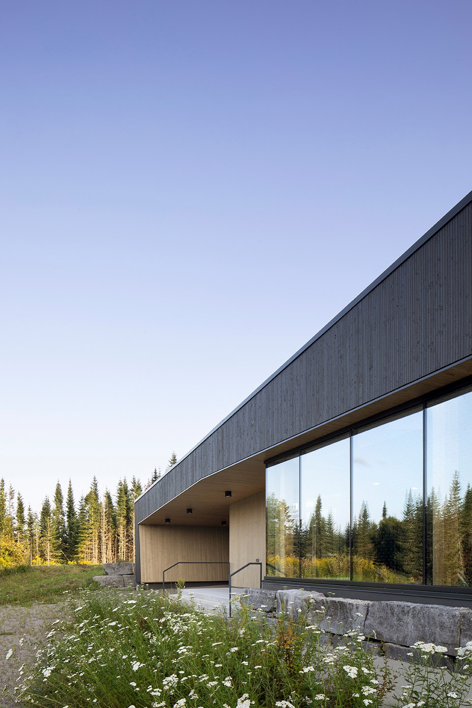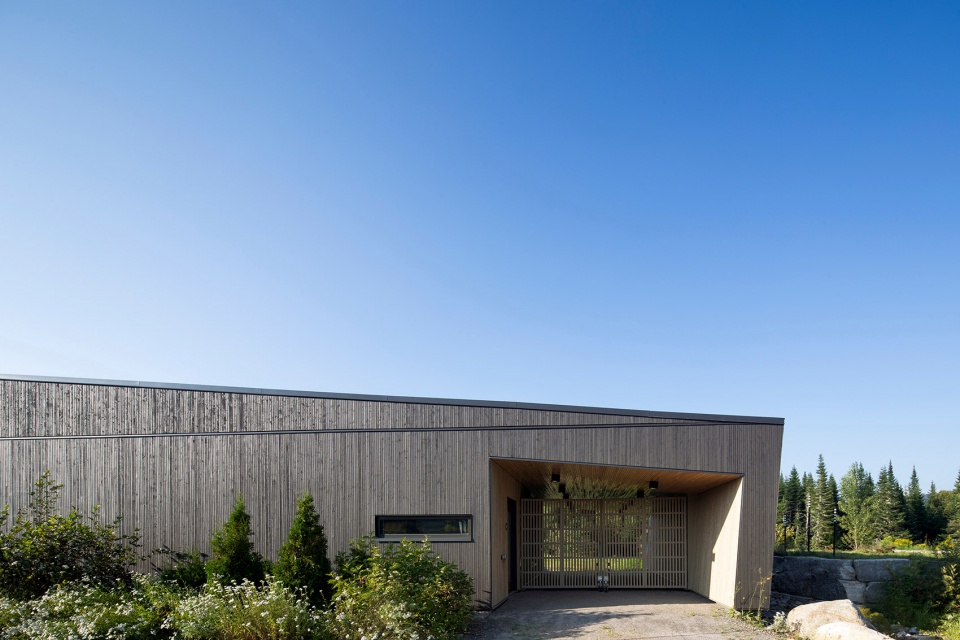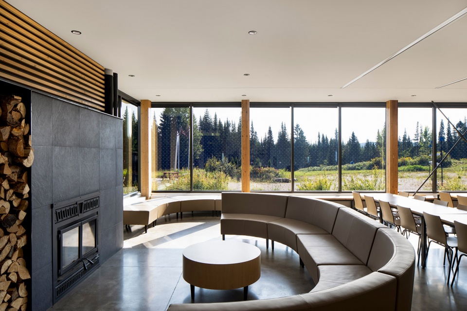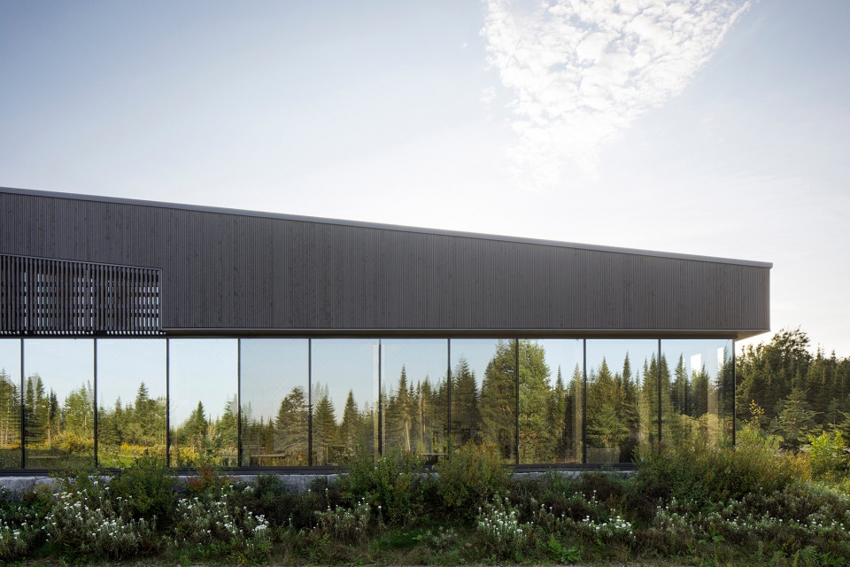 建筑设有大面积开窗,旨在框取周围自然景观,最大化引入阳光,同时促进室内外活动的连贯。深色外立面与明亮开口之间的对比,进一步强化了建筑的表达,灵感源自树木外皮与内部年轮之间的自然对比。项目在现代性与传统之间取得了平衡,体现了魁北克地区顺应季节变迁、与自然和谐共生的建筑文化,并致敬了先辈的智慧。