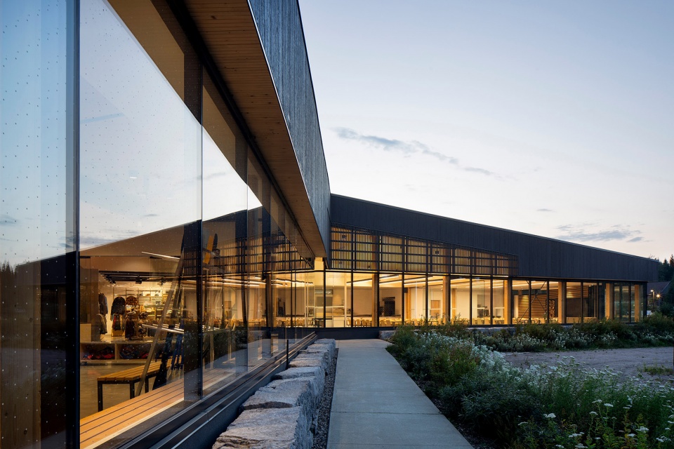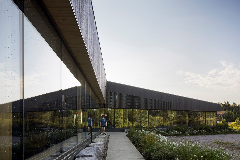 新接待馆的设计灵感源自早期伐木营地,采用木质结构、简洁的体量和低坡屋顶。立面上竖向铺设的深色云杉木饰面,仿佛重现了锯切木材的纹理。建筑表皮上开设的窗口,巧妙营造出光影变幻的效果,随着太阳轨迹的变化,投下动态的光影。