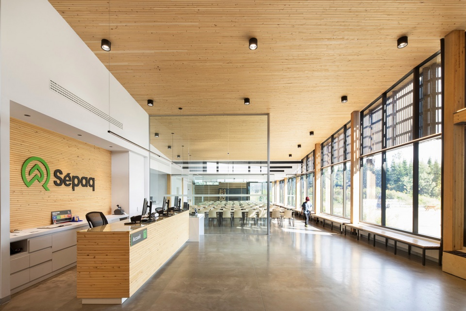 单层布局使整座建筑实现了完全的无障碍通行,同时也有效减弱了来自附近道路的噪音干扰。接待馆巧妙融入劳伦琴山(Laurentian Mountain)地貌,通过三翼布局和中央核心区高效组织空间流线,优化了访客动线和运营流畅性,为全年不同季节的到访者提供了全新的体验。