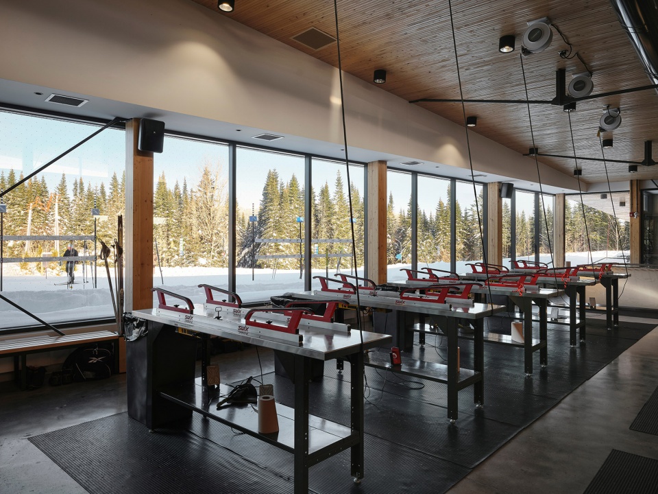 The surrounding landscape flows seamlessly into the pavilion, with vegetated embankments that allow for sliding during the winter, and a natural amphitheater with relaxation areas and outdoor fire pits. Special attention was given to the needs of ski enthusiasts, who are the primary users of the site. As a result, the new pavilion was built closer to the ski paths and oriented to offer better protection from the prevailing winds while maximizing sunlight exposure.