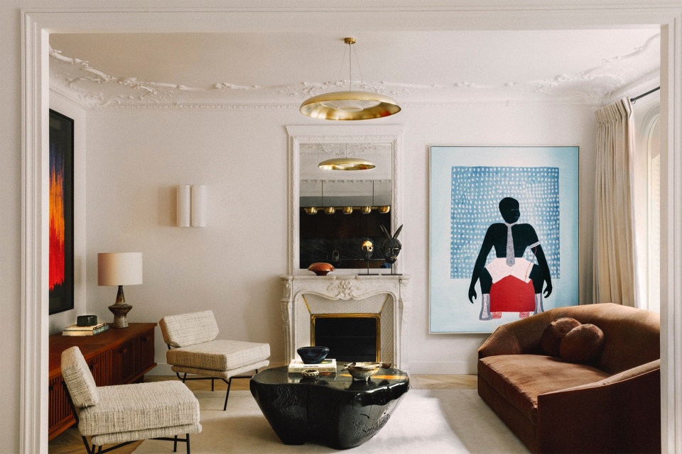 客厅中,马里艺术家Amadou Sanogo的画作与加州艺术家Dan Pollock手工雕刻的雪松木桌形成对话,RMGB亲自设计的沙发则出自他们将于2025年初推出的首个家具系列。