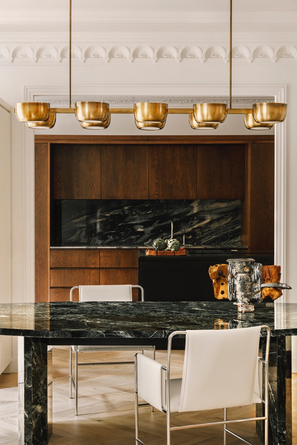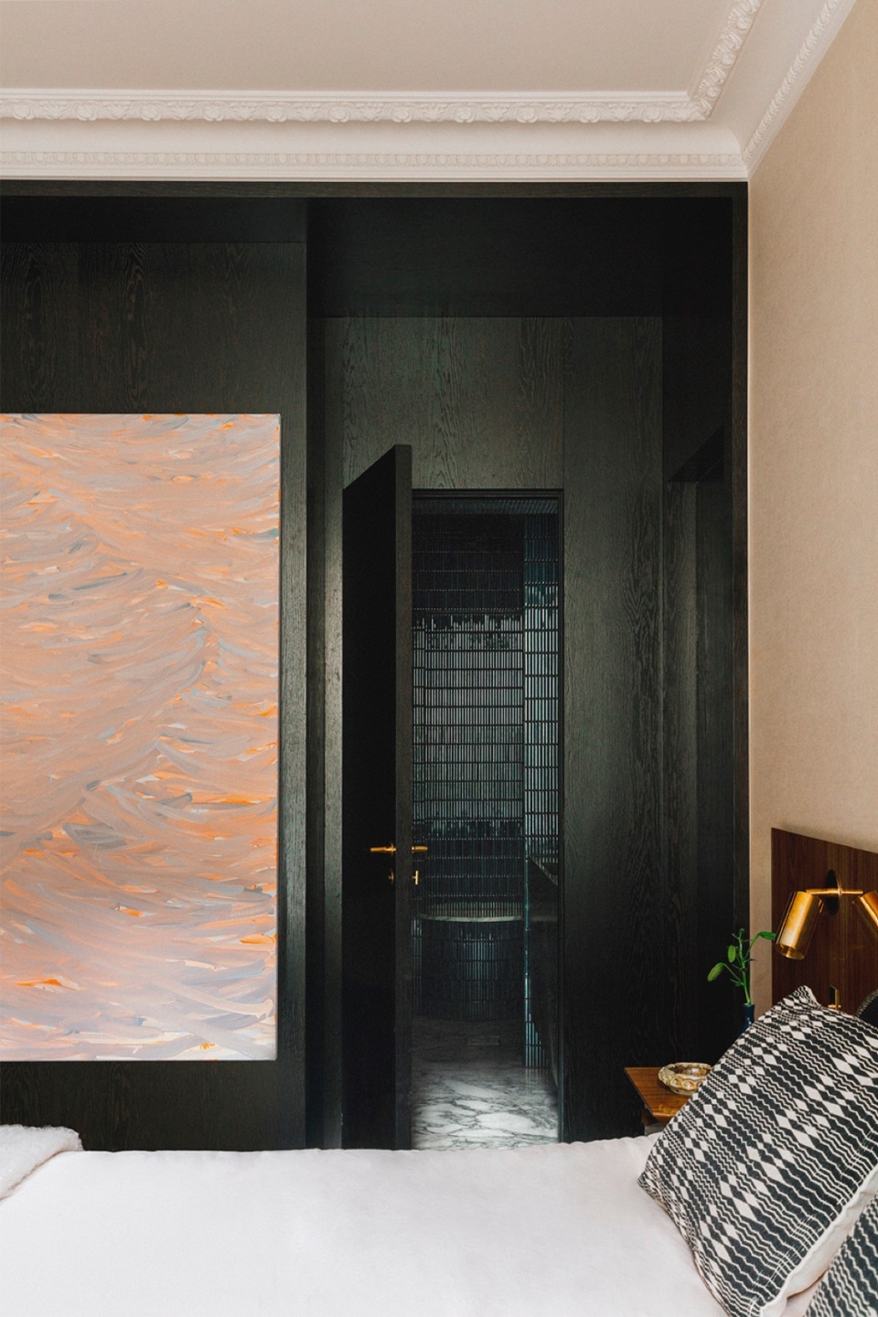 在精心修复石膏线与人字拼木地板后,RMGB彻底重塑了空间格局,将奥斯曼风格的建筑特征与屋主的个人审美融合。设计中包含一系列带有意式气息的定制家具——如餐桌、书桌和床头板,致敬意大利建筑大师Gio Ponti的代表作Planchart别墅,这也是屋主的重要灵感来源。