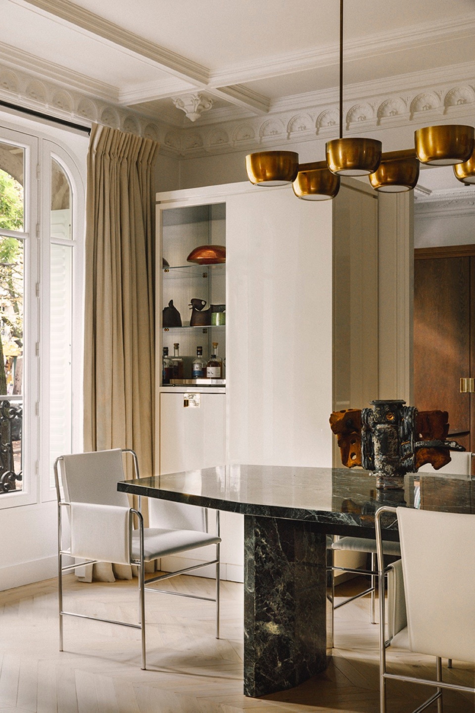 After meticulously restoring the mouldings and parquet floors, RMGB completely redesigned the space to marry the hallmarks of Haussmannian architecture with the personal sensibilities of the owners. The result is a range of bespoke furniture with Italian overtones – including the dining table, desk and bedhead – a nod to Gio Ponti’s architectural masterpiece the Villa Planchart, an important aesthetic inspiration for the clients.