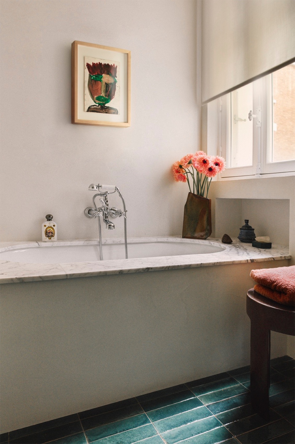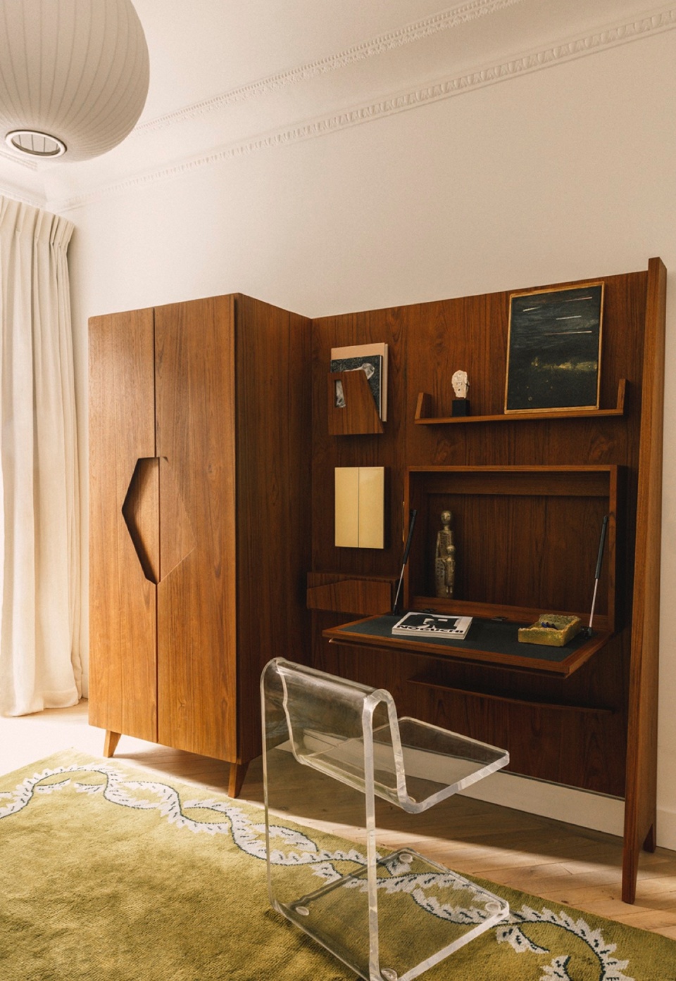 Again in homage to the work of Gio Ponti, the study is organized around a large piece of bespoke teak furniture, enabling focused design work without distorting the volume of the room. The walls of the main bathroom are skimmed in cement, with gloss-glazed terracotta tiles on the floor, creating a warm and gently coloured atmosphere.
