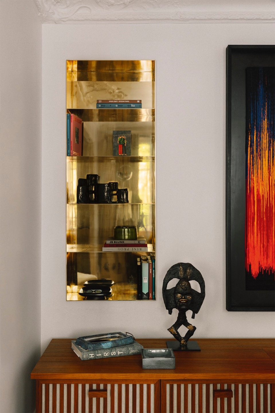 In the sitting-room, the piece by Malian artist Amadou Sanogo dialogues with a magnificent table hand-carved in solid cedar in California by Dan Pollock, and the sofa designed by RMGB, a piece from their first collection, which is to be launched at the beginning of 2025.