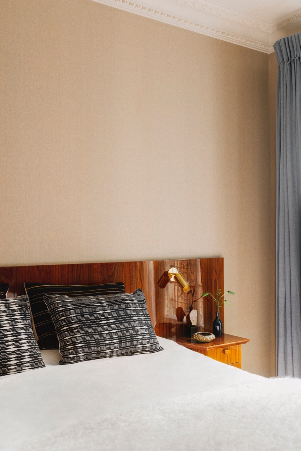 The main bedroom has been designed like a hotel suite, with dressing-room and en suite bathroom. The cotton wallpaper, gloss-finish teak headboard and pale blue curtains also reflect the owners’ Italian aspirations and the distinctly Parisian aesthetic of the apartment.