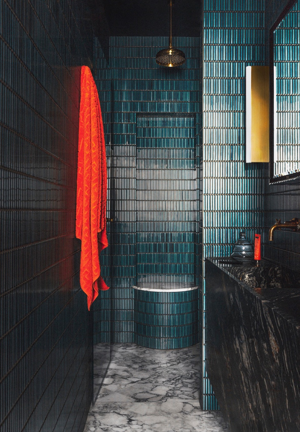 书房再次向Gio Ponti的作品致敬,围绕一件定制柚木家具展开布局,既满足专注工作的需求,又不破坏原有空间比例。主卫墙面采用水泥抹灰,地面铺设亮面陶砖,营造出温润柔和的氛围。