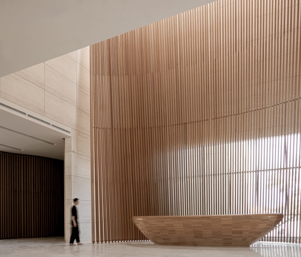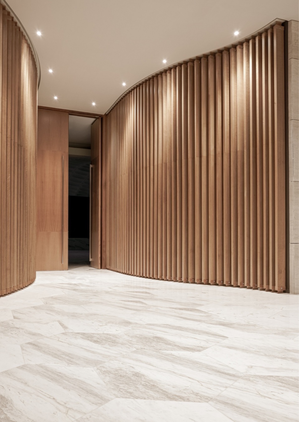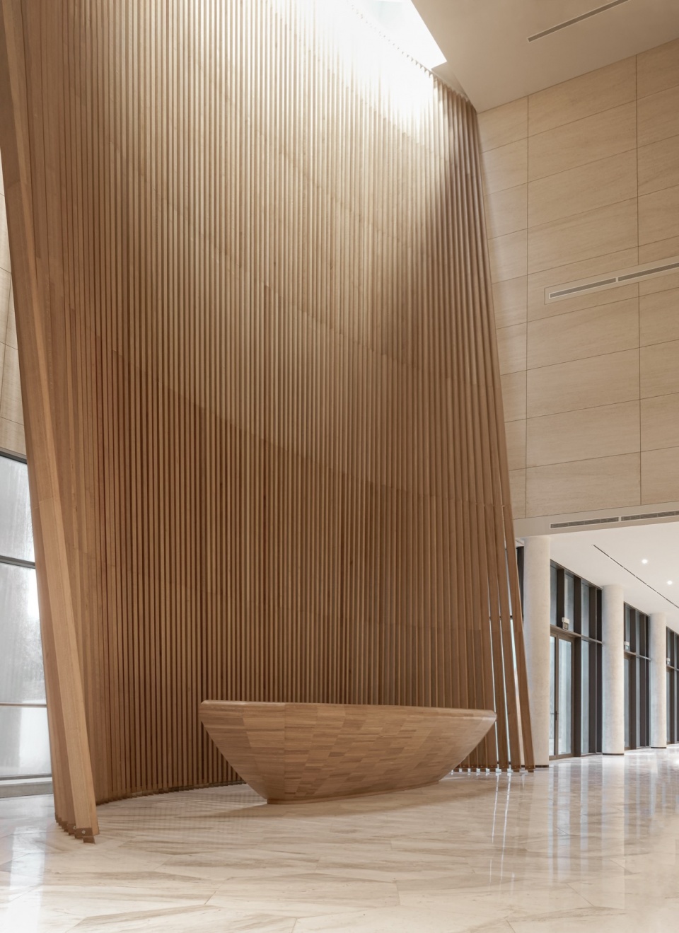 The design of the finishes was key to this. The use of textured surfaces and forms such as natural wood and limestone help reflect light in subtle ways to create a sense of depth and movement. These textures enhance both the visual and tactile experience. The color of the natural wood was selected based on how it reflected daylight to enhance the warmth of the interior space. The patterning of surfaces such as the wall panels and marble stone flooring contributes to a multi-layered interaction with the space.