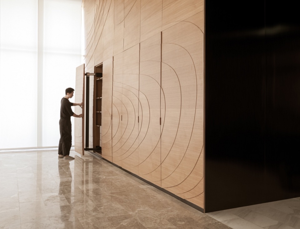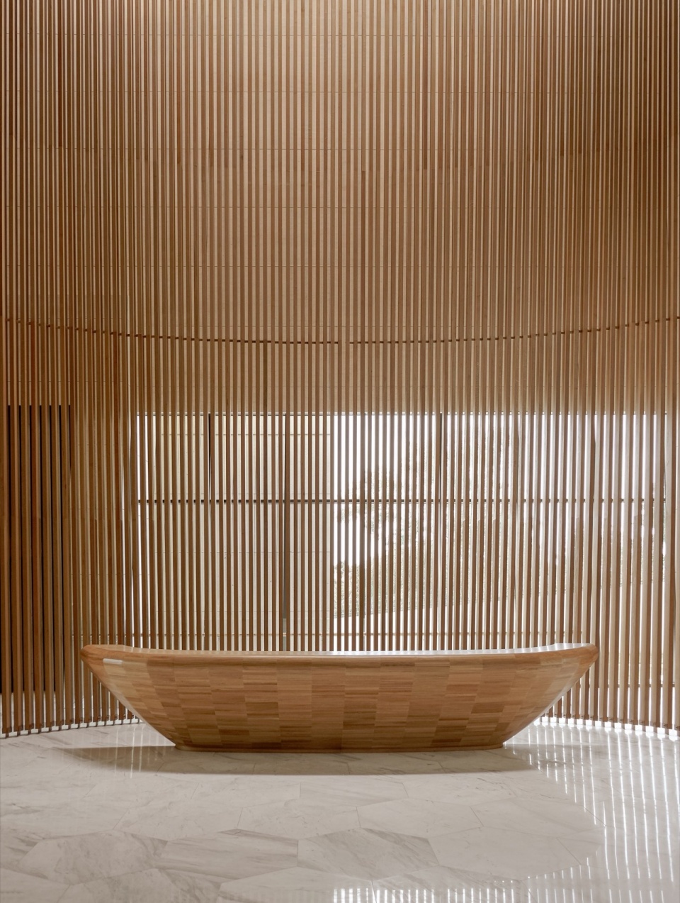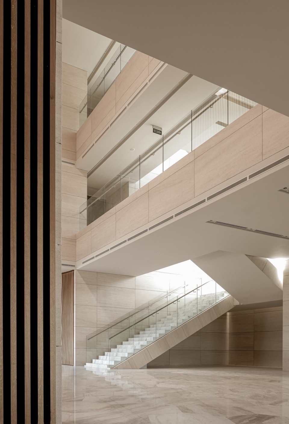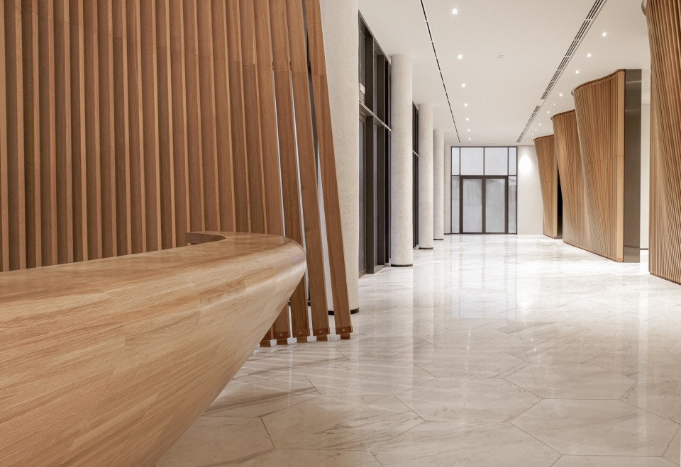The design of the finishes was key to this. The use of textured surfaces and forms such as natural wood and limestone help reflect light in subtle ways to create a sense of depth and movement. These textures enhance both the visual and tactile experience. The color of the natural wood was selected based on how it reflected daylight to enhance the warmth of the interior space. The patterning of surfaces such as the wall panels and marble stone flooring contributes to a multi-layered interaction with the space.