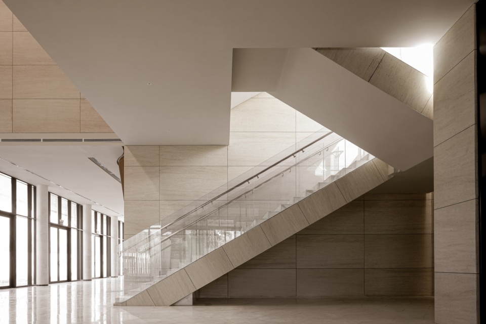 室内设计的目标是营造一种温馨宜人的环境,并在人的行进过程中提供触感上的愉悦体验。材质的肌理与空间的开放性共同营造出沉浸式的空间感受。通过材质与光线、触觉的相互作用,设计意在塑造“感受到的美”,而非仅供观赏的美。对于一座安保等级较高的建筑而言,这种开放感是相对罕见的,它营造了一种非机构化的、欢迎式的氛围,弱化了通常意义上的压迫感。这种透明性的策略也体现在空间视觉的连通性上,使大使馆整体更具连贯感。开放视野使馆内人员大多在自然光下办公,白天基本无需人工照明。