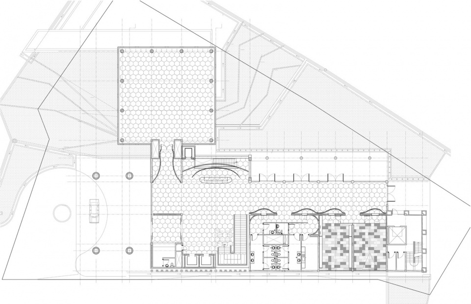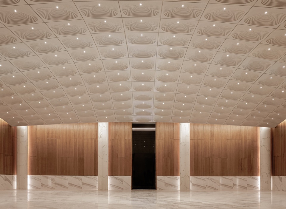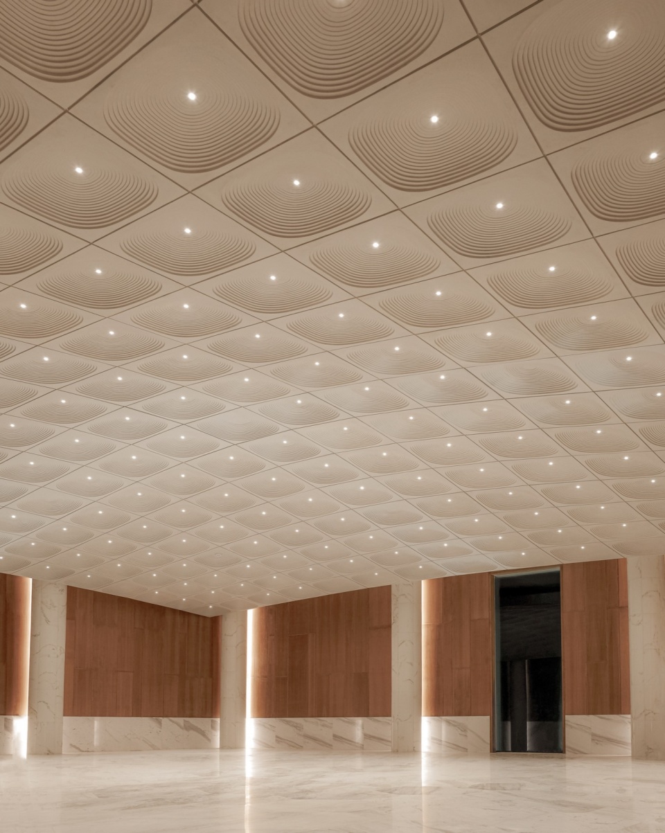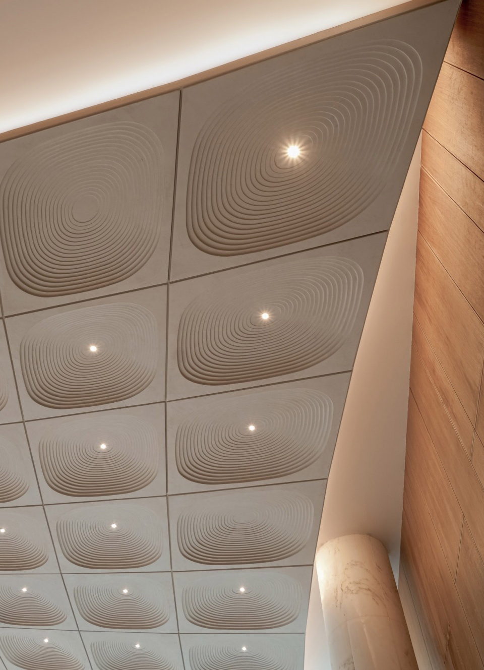 The ceiling design in the reception hall is conceived as a visually striking and crafted pattern of concentric, undulating forms that create a dynamic interplay of depth and texture. Each panel was carved from polymer in shapes that, when combined, form an acoustic-friendly, three-dimensional surface. The sculptural quality of the design adds a sense of movement to the ceiling, while the repetition of the modules ensures a harmonious and unified formal language. Integrated lighting, embedded within the recessed patterns, accentuates the detailing and provides a soft, ambient glow, enriching the spatial experience.